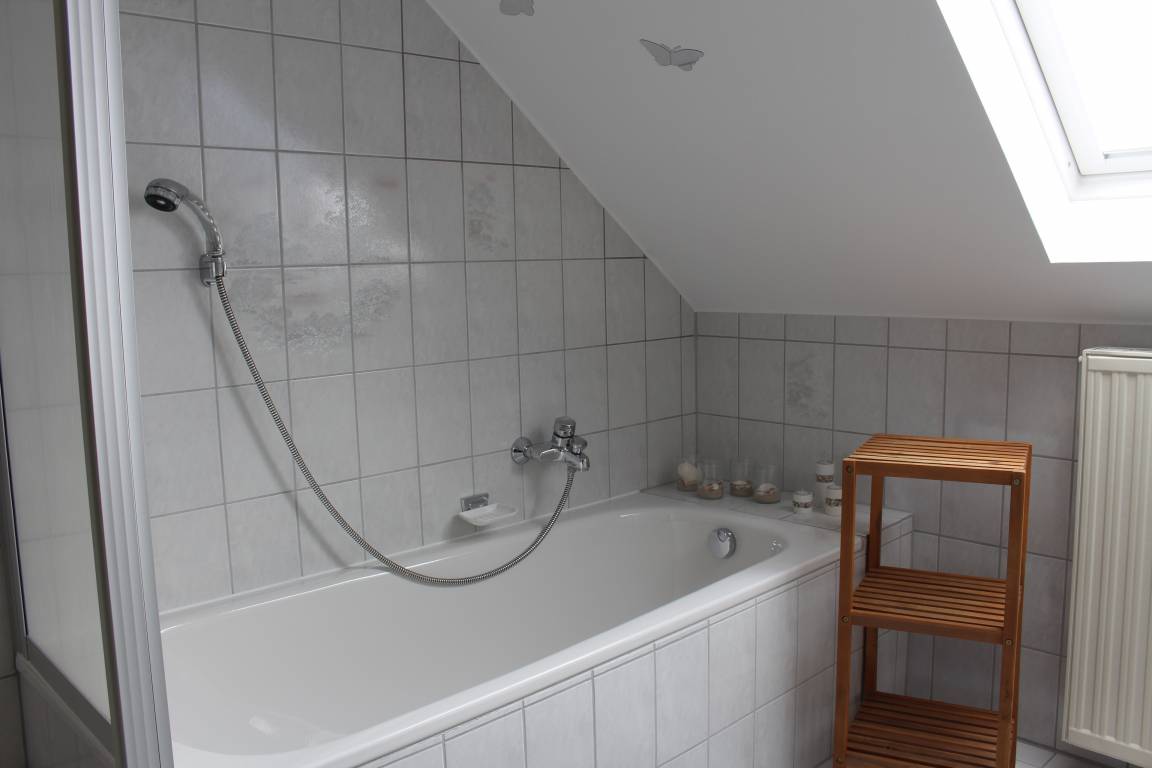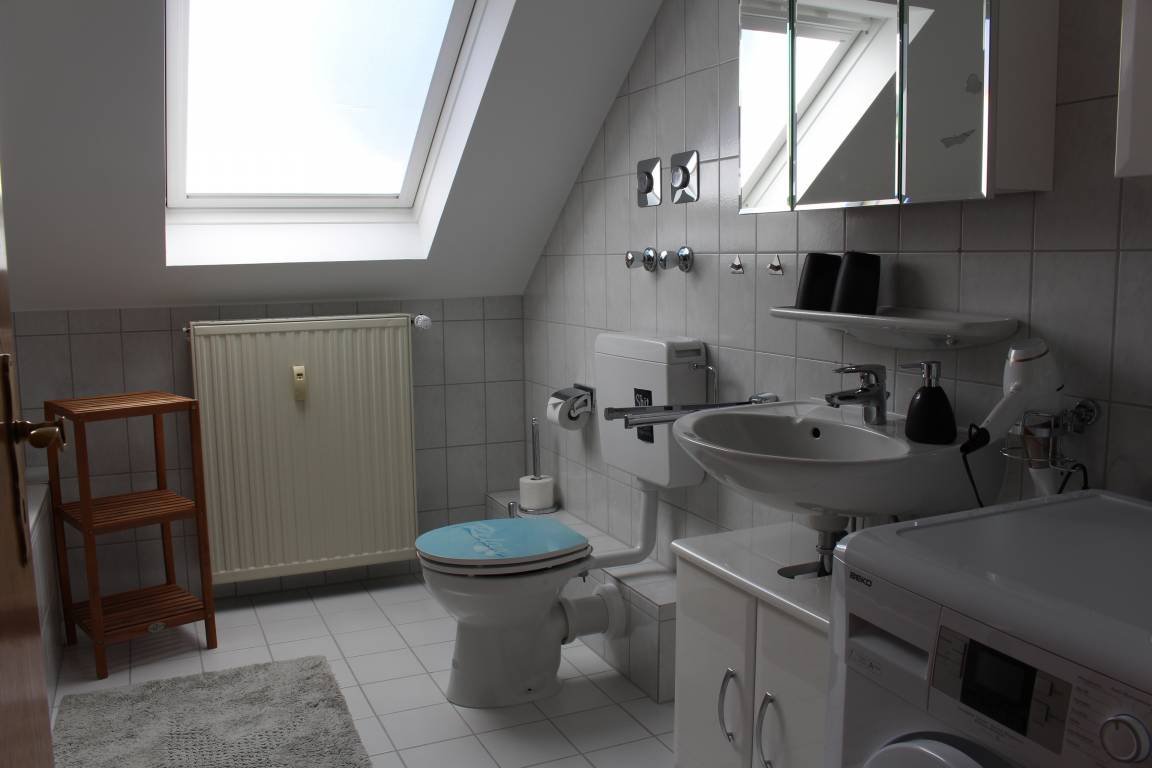 Das Tageslichtbad ist mit Dusche, WC, Badewanne und Waschmaschine ausgestattet. Auch ein Haarfön, Shampoo, Haarspülung, Handseife und Duschgel können verwendet werden.