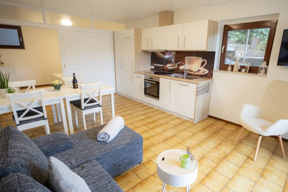 Die Ferienwohnung "Kirchblick" im Erdgeschoss bietet auf 55qm Erholung für 4 Personen zuzüglich eines Kleinkindes im Babybett. Auf der eigenen Terrasse, die ebenerdig an den geräumigen und sehr gemütlichen Wohn-/Essbereich angrenzt, finden Sie Gartenmöbel mit bequemen Auflagen und einen Grill.