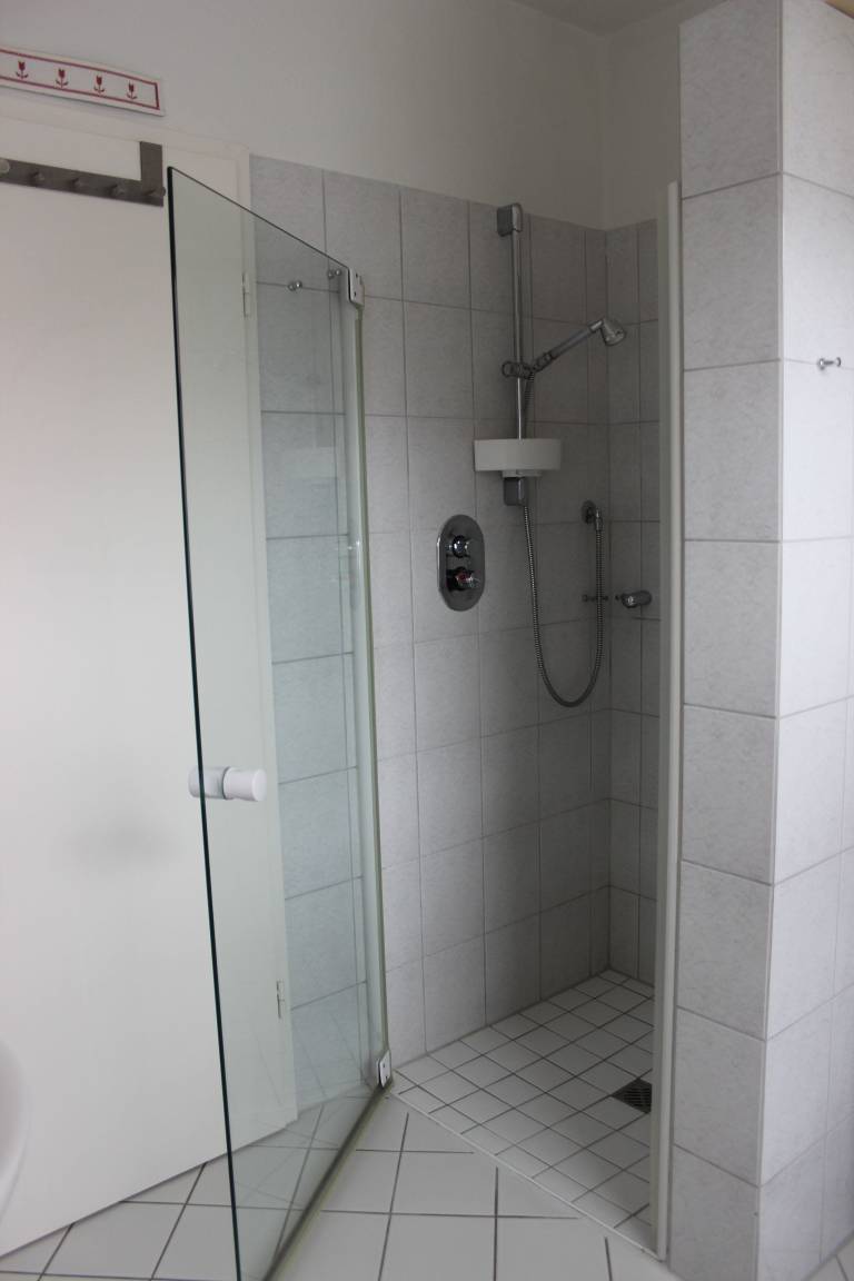 Das Bad weist eine ebenerdige Dusche aus, sowie eine erhöhte Toilette. Zudem ist ein Trockner und eine Waschmaschine vorhanden.