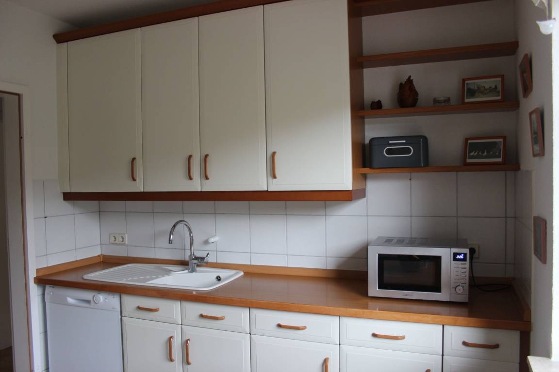 Zur Küche gehören u.a. ein Elektroherd mit Cerankochfeld, Spül- und Kaffeemaschine, Wasserkocher und Toaster und ausreichend Geschirr und Töpfe.