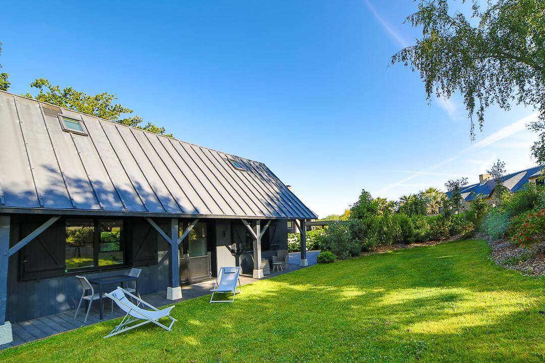 Ein Garten und eine überdachte Terrasse mit Esstisch, Liegestühlen und elektrischer Plancha.