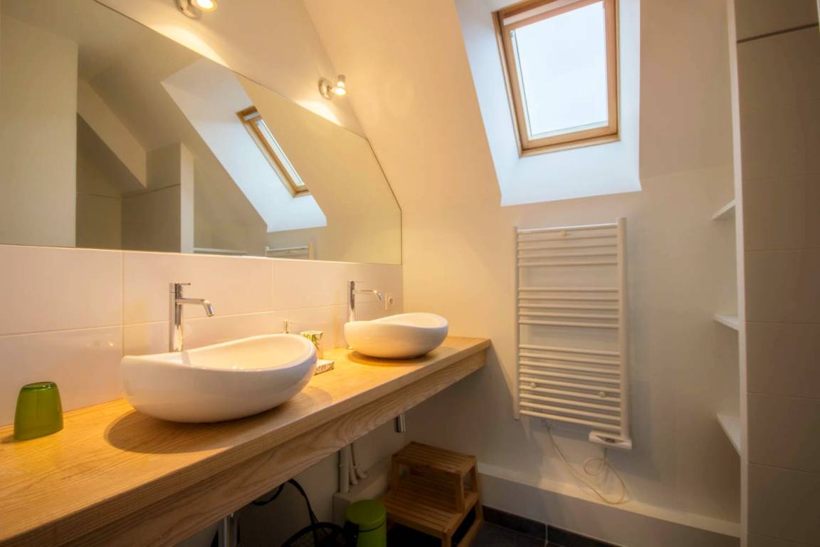 - Im 1. Stock: 2 Schlafzimmer, eines mit 1 160 Betten, das andere mit 1 160 Betten (unterteilbar in 2x80) und 1 80 Betten, ein Badezimmer und eine separate Toilette.