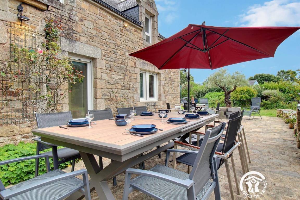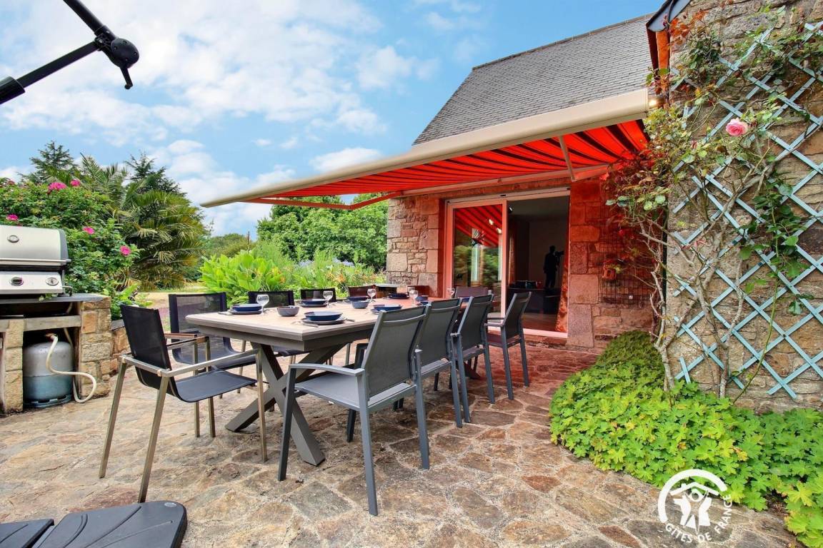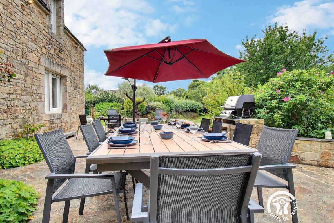 - Große Terrasse mit Gartenmöbeln, Sonnenschirm, Markise und Grill