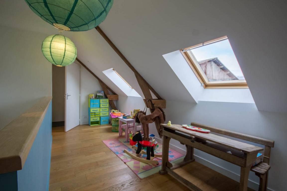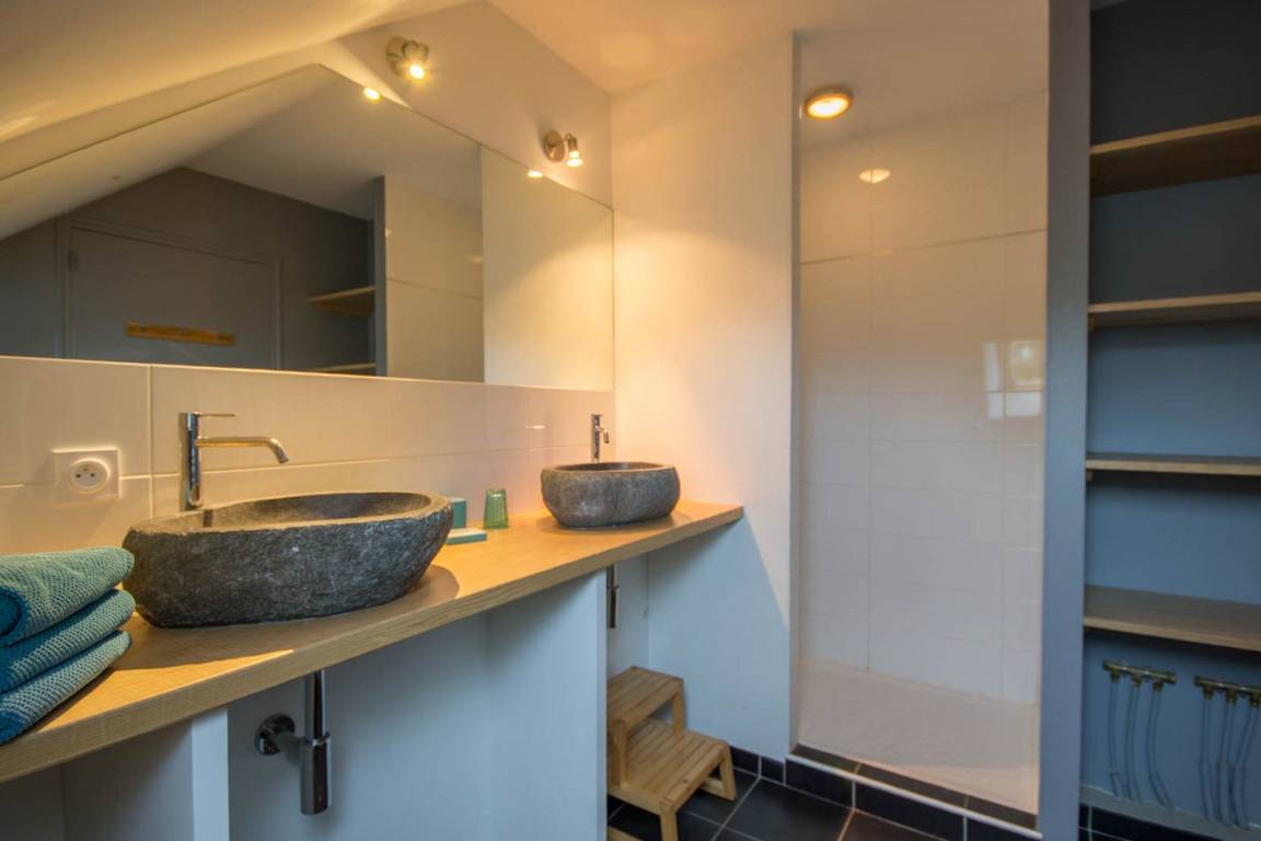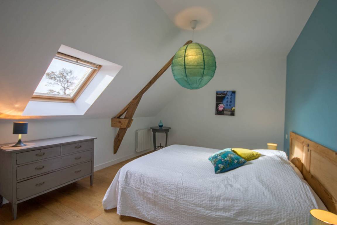 - Im 1. Stock: 3 Schlafzimmer: eines mit 1 160-cm-Bett und zwei weitere mit 2 160-cm-Betten (teilbar in 2 x 80), darunter ein Treppenabsatz, ein Badezimmer und eine separate Toilette.