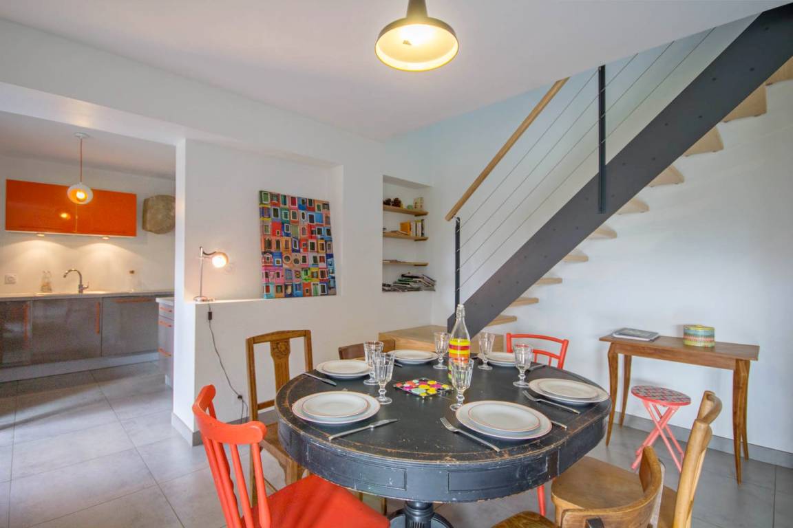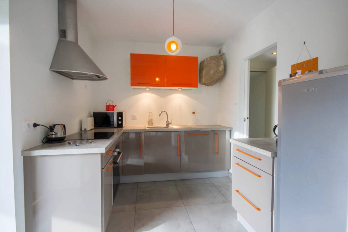 - Im Erdgeschoss: ein Wohnzimmer mit ausgestatteter Küche, Wohnzimmer und Lounge, eine Toilette mit Waschbecken.