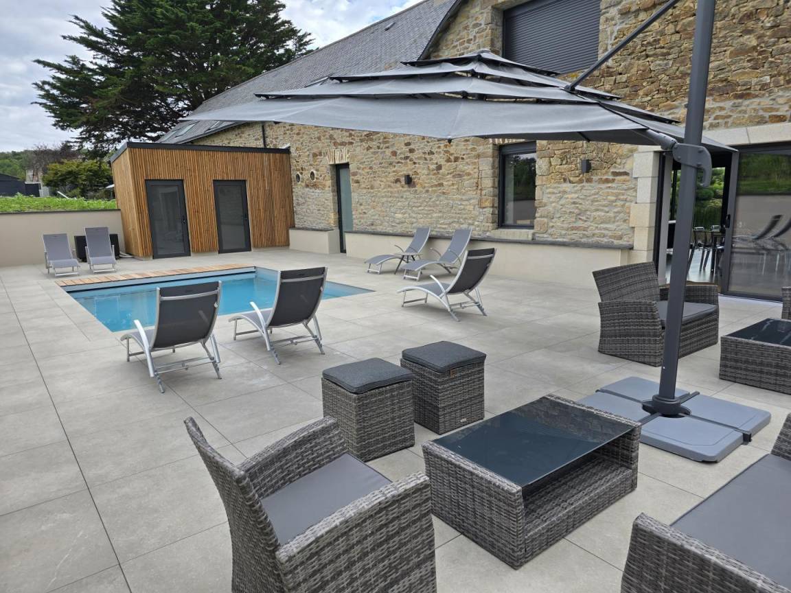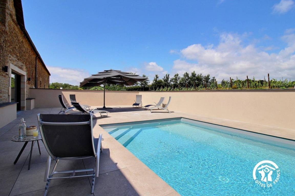 - 137 m² große Terrasse nach Süden/Westen (Blick auf die Weinberge) mit beheiztem Pool (5 x 4 m; Tiefe: 1,80) und Liegestühlen.
