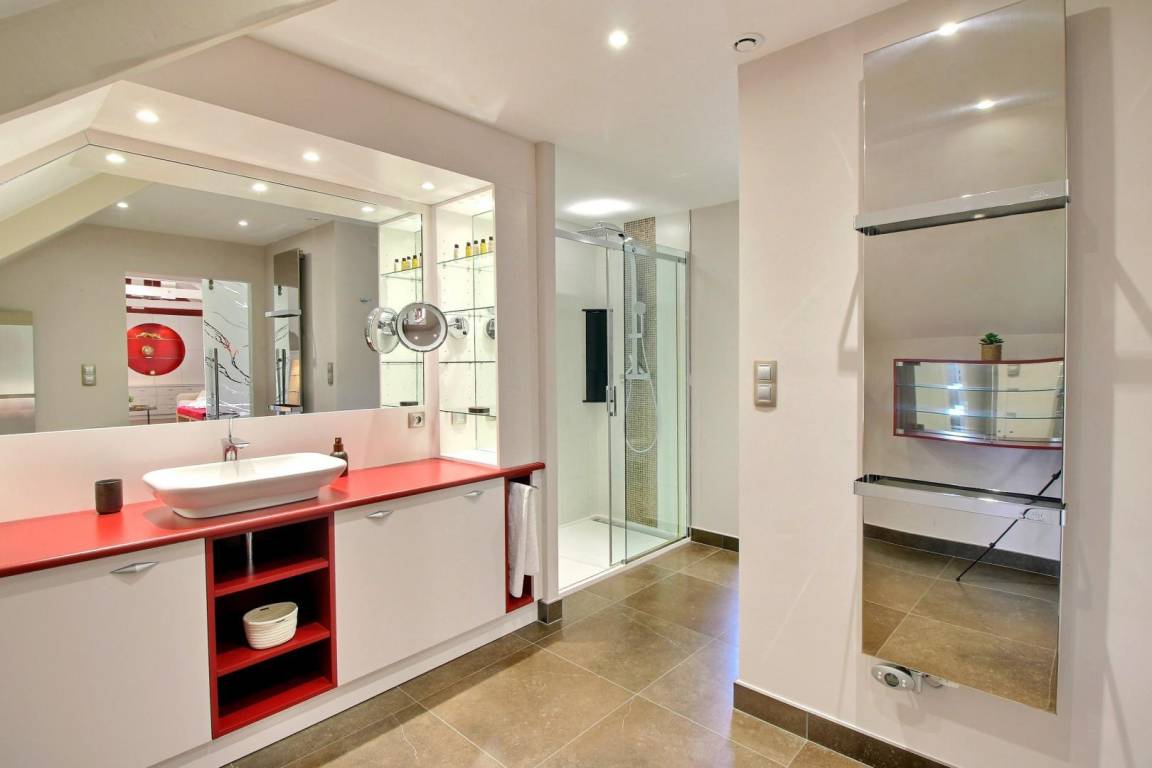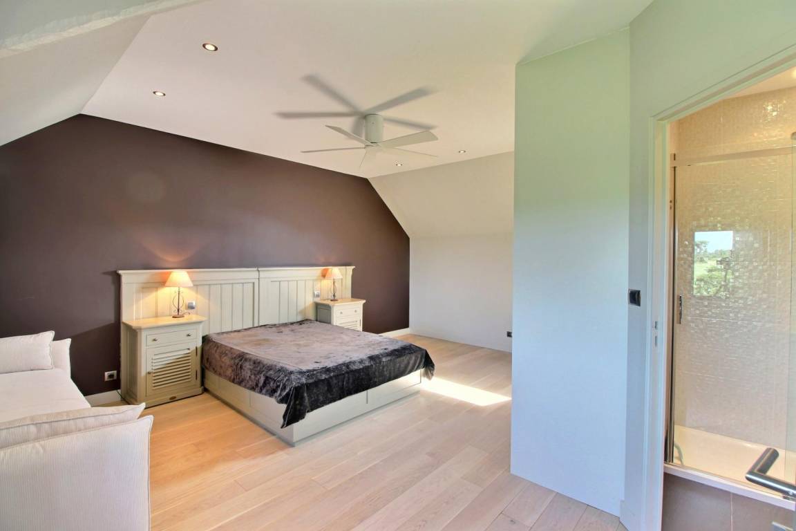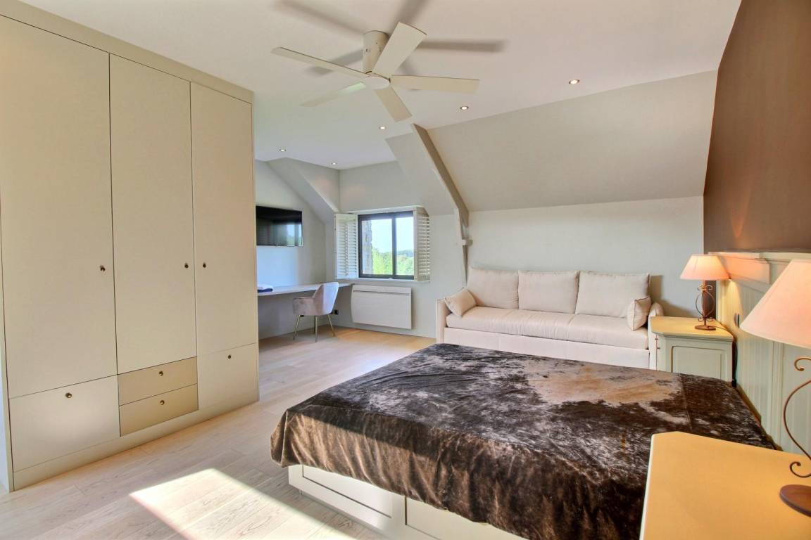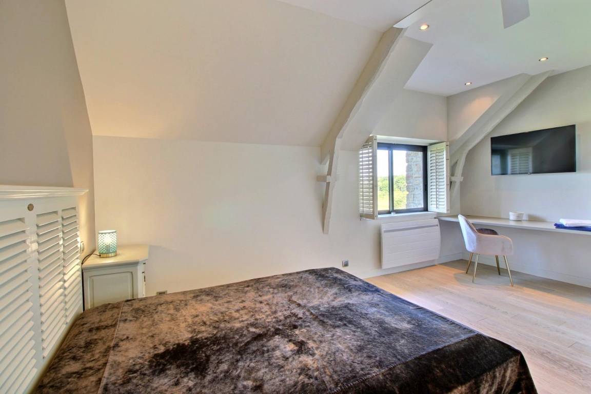 - Zwei Schlafzimmer von 30 und 18 m² (2 140 x 190 Betten + TV) mit gemeinsamem und miteinander verbundenem Bad/WC