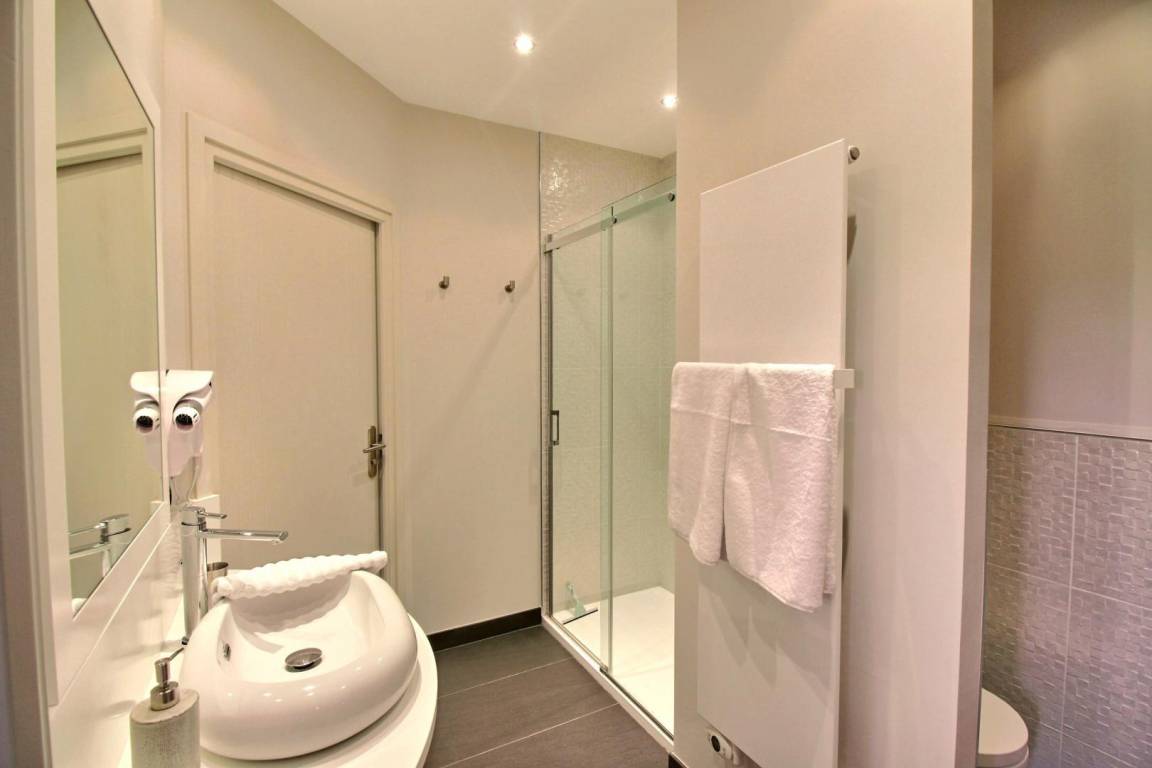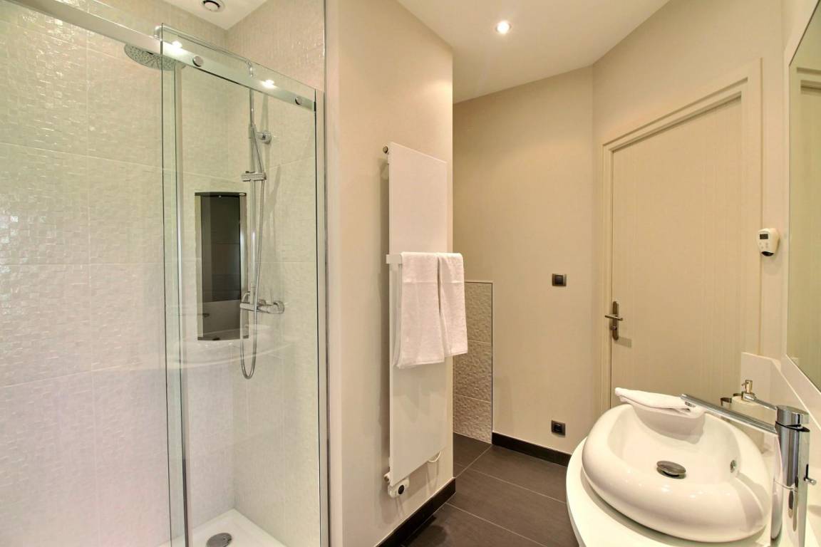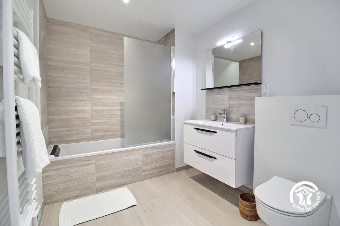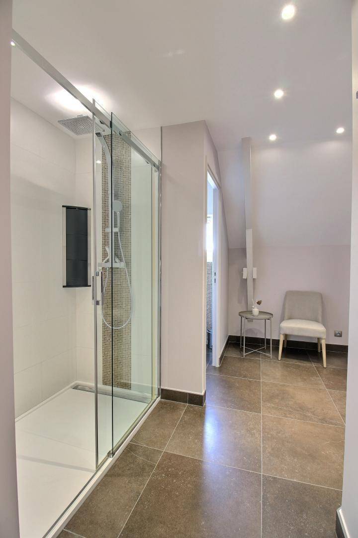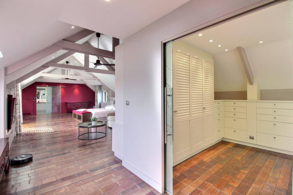 - Zwei Schlafzimmer von 30 und 18 m² (2 140 x 190 Betten + TV) mit gemeinsamem und miteinander verbundenem Bad/WC
