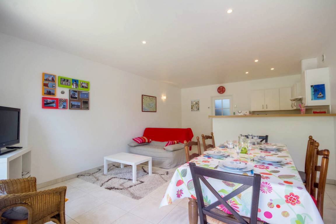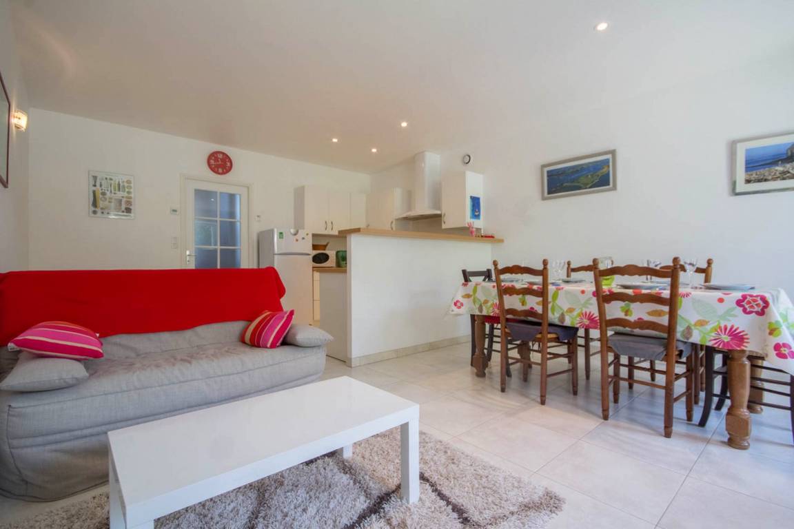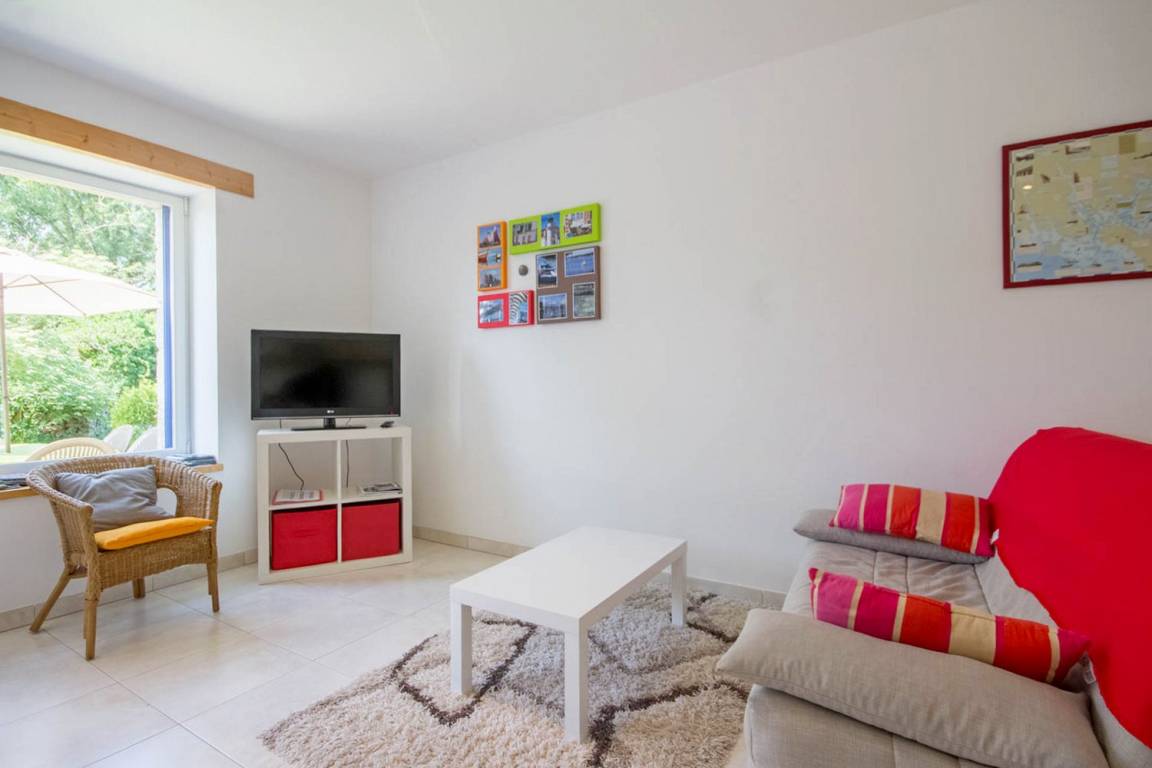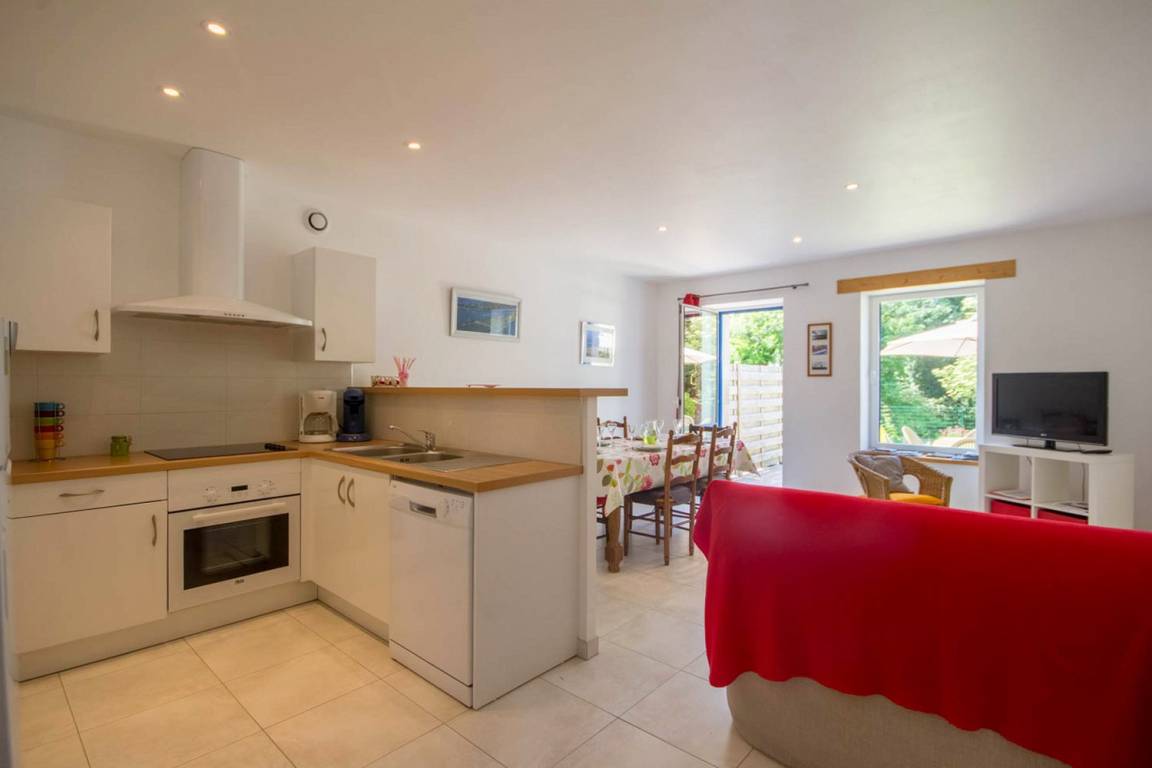 Lernen Sie das angenehme Leben im Süd-Morbihan kennen. Hier sind Sie im Regionalen Naturschutzpark des Golfs von Morbihan, der als eine der schönsten Buchten der ganzen Welt gilt, und nur 200m vom Golf entfernt: zauberhaft schöne kleine Buchten, Strände und Inseln, die Sie auf Wanderungen an den Küstenwanderwegen entdecken können. In Port-Blanc (5 Min) können Sie ein Kreuzfahrtschiff nehmen und die Inseln im Golf entdecken (Ile aux Moines und Ile d'Arz) oder Sie fahren noch weiter hinaus bis auf den Ozean (Belle-Ile und Houat). Wassersport- und Golfmöglichkeiten gleich vor Ort. In den Geschäften von Baden (2 km) finden Sie alles, was Sie während Ihres Aufenthaltes brauchen. Wichtige Sehenswürdigkeiten: das historische Stadtzentrum von Vannes mit Stadtgarten und Festungsmauern, Auray mit dem Hafen Saint-Goustan und den Künstlerateliers… Die schönen Strände mit feinem Sand in Erdeven und die Menhire in Carnac sind 35 Min vom Ferienhaus entfernt. Im EG: ein Wohnbereich mit Küche/Esszimmer