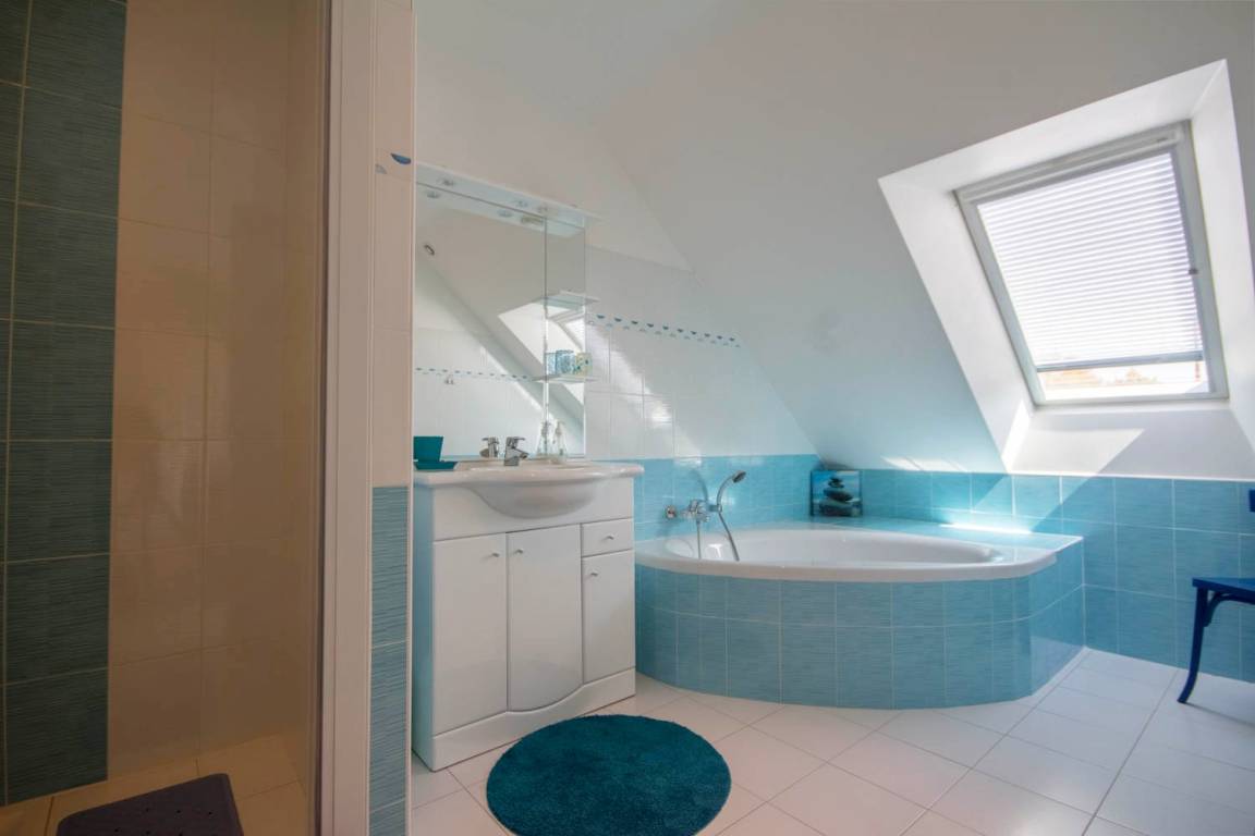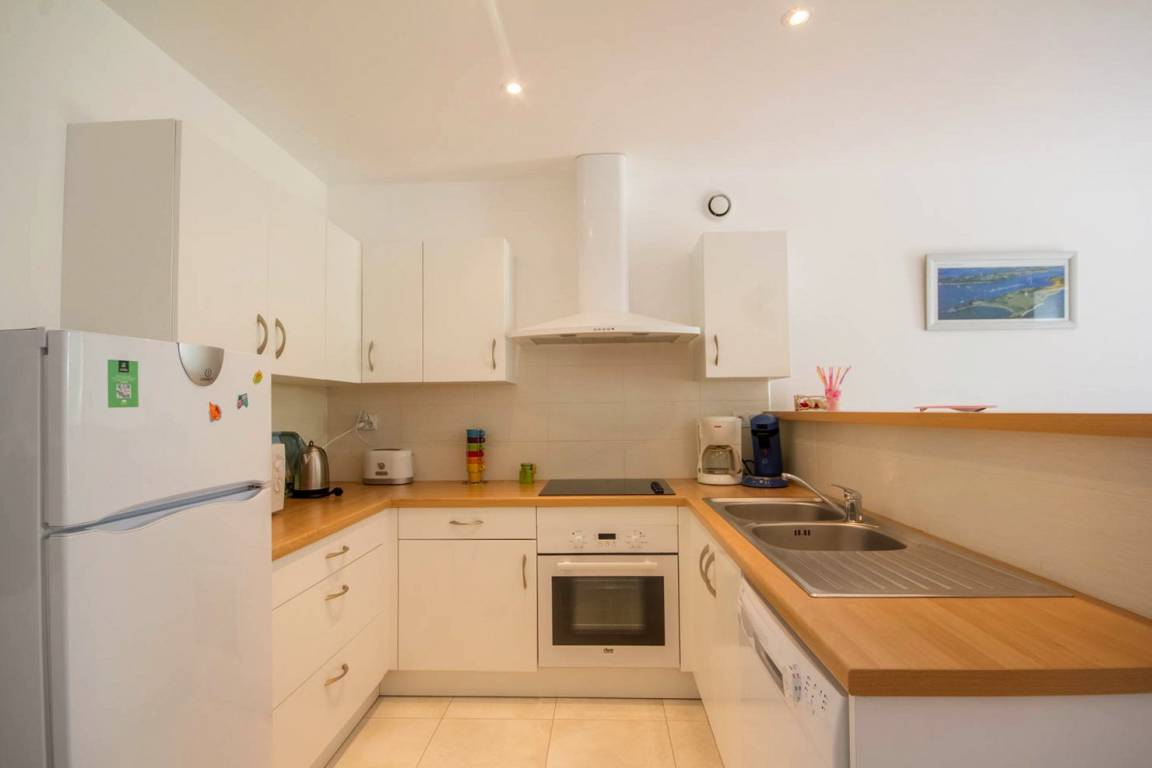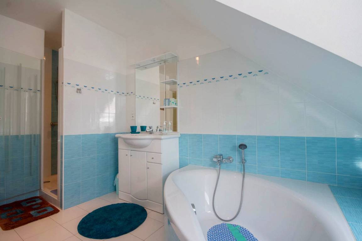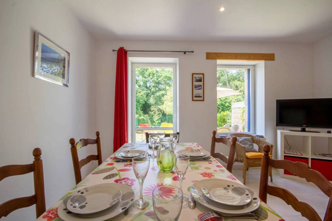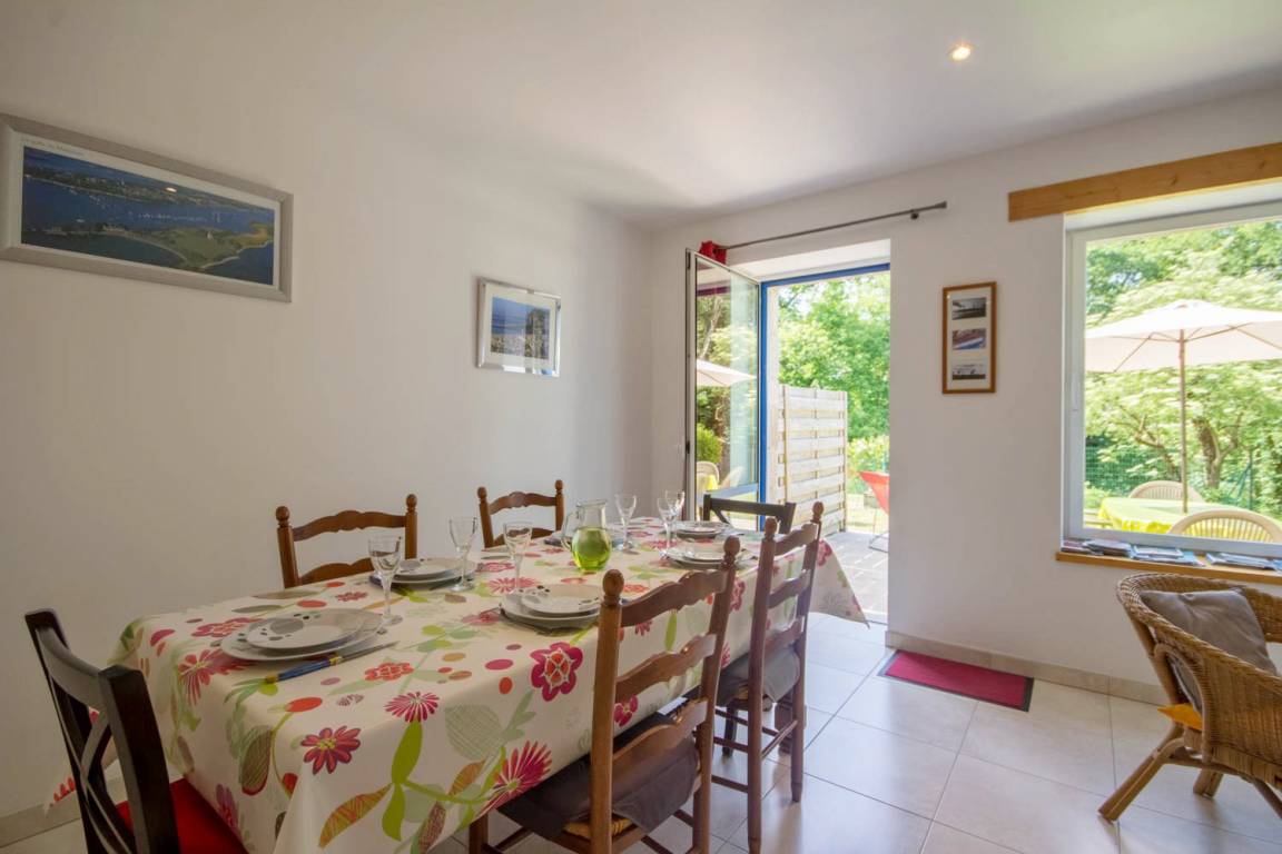 Lernen Sie das angenehme Leben im Süd-Morbihan kennen. Hier sind Sie im Regionalen Naturschutzpark des Golfs von Morbihan, der als eine der schönsten Buchten der ganzen Welt gilt, und nur 200m vom Golf entfernt: zauberhaft schöne kleine Buchten, Strände und Inseln, die Sie auf Wanderungen an den Küstenwanderwegen entdecken können. In Port-Blanc (5 Min) können Sie ein Kreuzfahrtschiff nehmen und die Inseln im Golf entdecken (Ile aux Moines und Ile d'Arz) oder Sie fahren noch weiter hinaus bis auf den Ozean (Belle-Ile und Houat). Wassersport- und Golfmöglichkeiten gleich vor Ort. In den Geschäften von Baden (2 km) finden Sie alles, was Sie während Ihres Aufenthaltes brauchen. Wichtige Sehenswürdigkeiten: das historische Stadtzentrum von Vannes mit Stadtgarten und Festungsmauern, Auray mit dem Hafen Saint-Goustan und den Künstlerateliers… Die schönen Strände mit feinem Sand in Erdeven und die Menhire in Carnac sind 35 Min vom Ferienhaus entfernt. Im EG: ein Wohnbereich mit Küche/Esszimmer