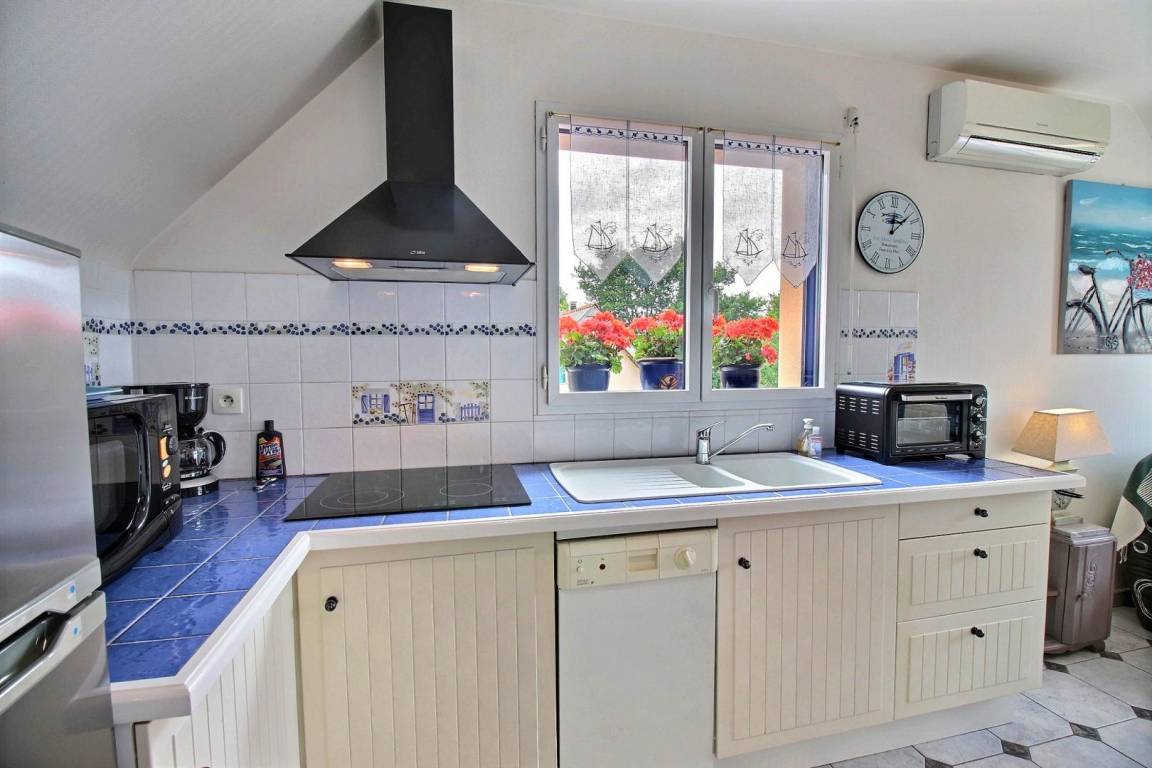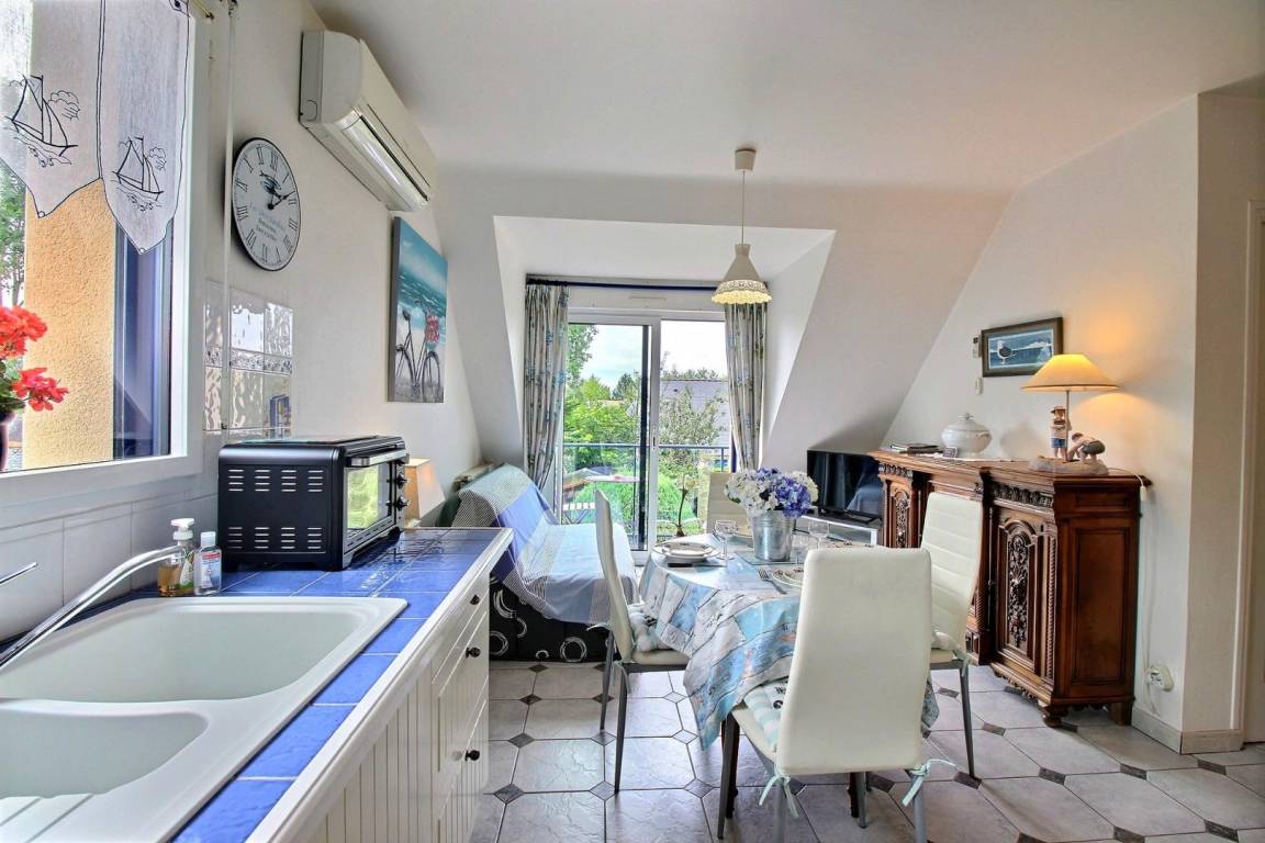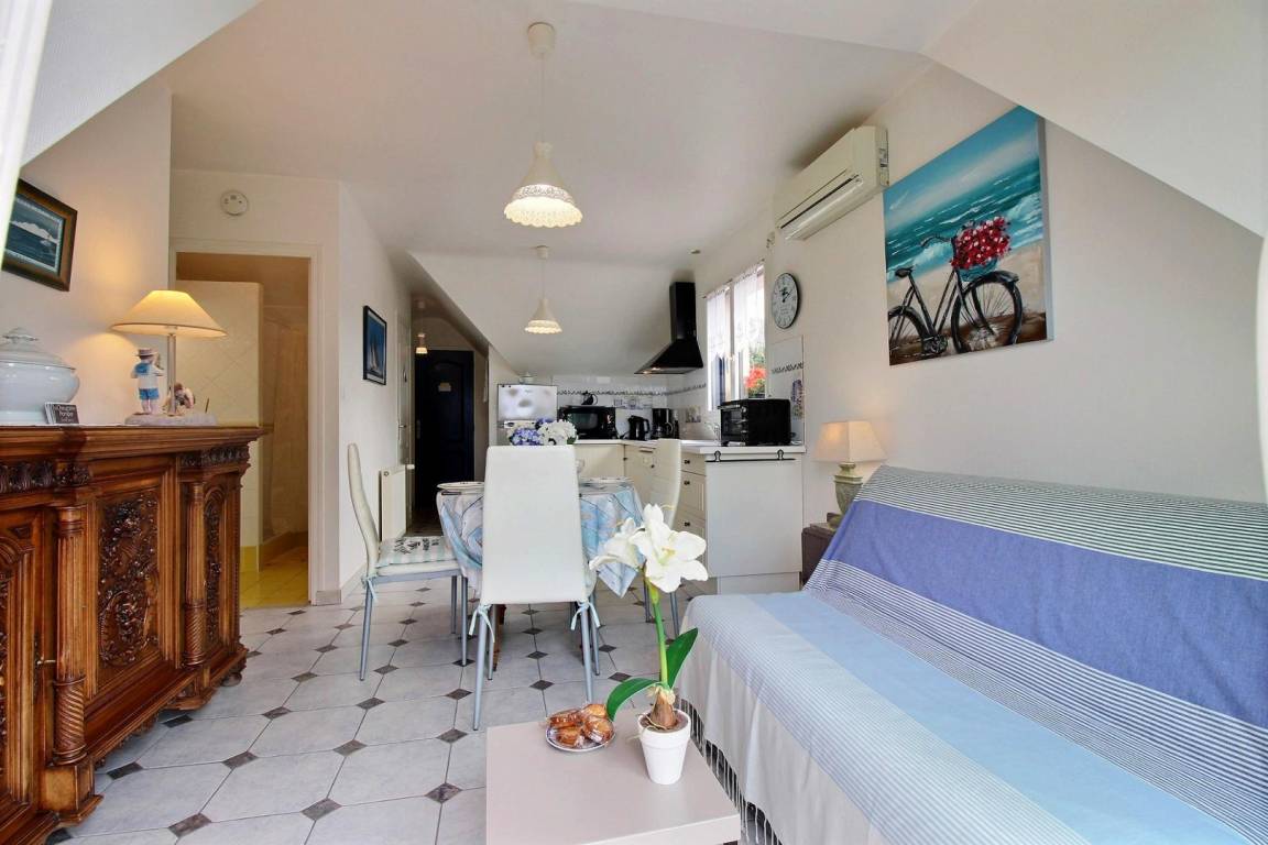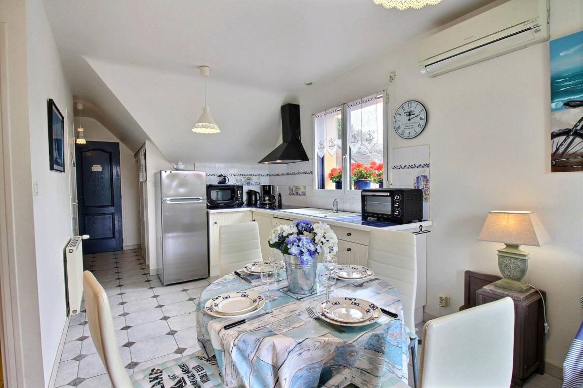 Dieses Apartment mit individuell regulierbarer Klimaanlage befindet sich in ruhiger Lage abseits der Straße. Es befindet sich im 1. Stock auf der gleichen Ebene. Sie bietet Ihnen ein Wohnzimmer mit Einbauküche, Wohn- und Aufenthaltsraum (1 Schlafcouch für 2 Personen in 140), ein Schlafzimmer (1 Bett in 140), ein Badezimmer und ein separates WC. Vom Wohnzimmer aus öffnet sich ein französisches Fenster auf den Südbalkon mit Blick auf einen angelegten Garten mit Blumen zu jeder Jahreszeit. Sie werden die Stille zu schätzen wissen, während Sie Ihre Mahlzeiten in der Sonne einnehmen. Ein kleiner Ruhebereich ist mit Liegestühlen, Gartenmöbeln und Grill für Sie reserviert.