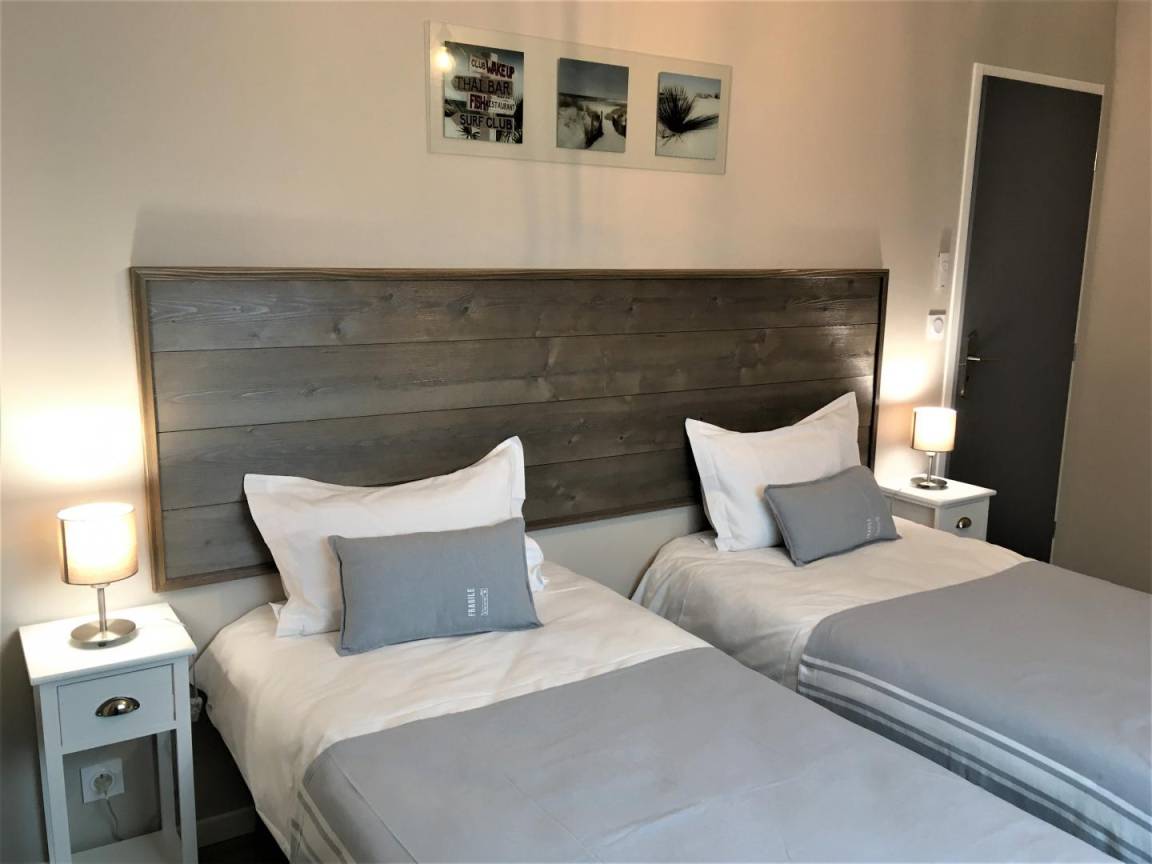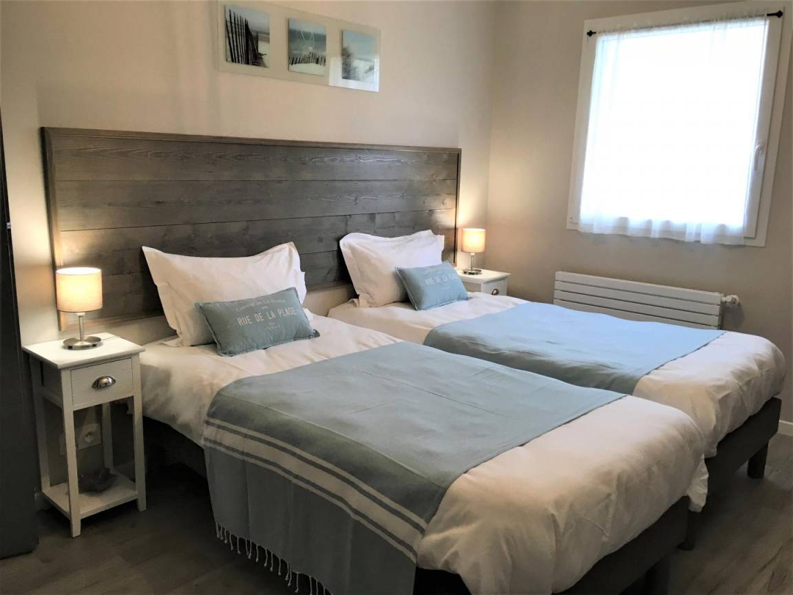 Obergeschoss: 3 Schlafzimmer, jeweils mit 2 Einzelbetten (90x190 cm), die zu Doppelbetten (180x190 cm) zusammengestellt werden können, ein Badezimmer und ein separates WC