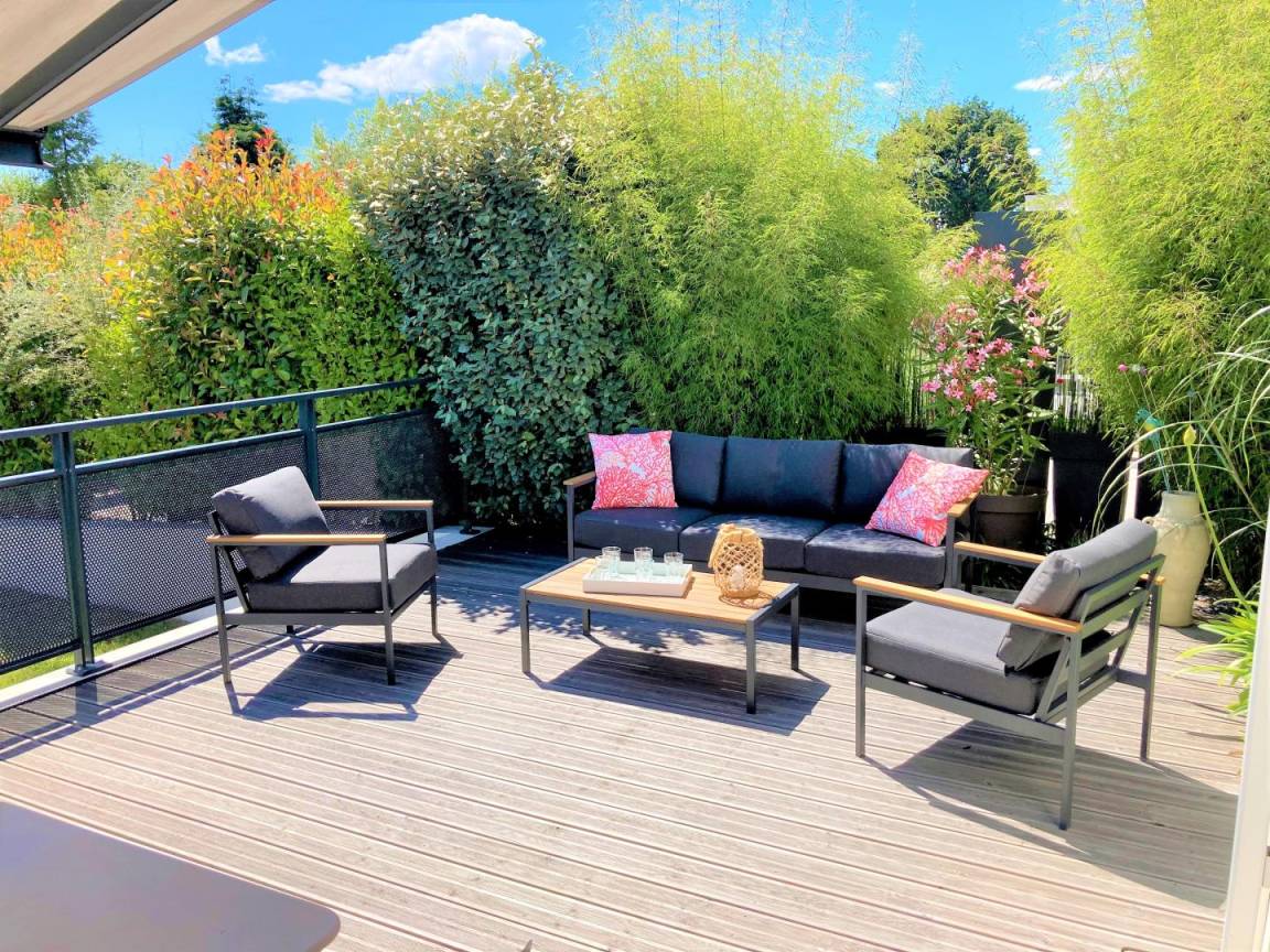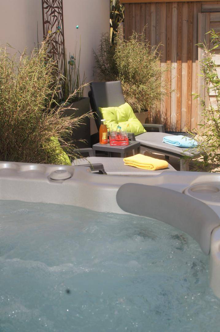 Genießen Sie Ihren Aufenthalt: eine herrliche, 45 m² große, nach Süden ausgerichtete Holzterrasse mit überdachtem Whirlpool für 5 Personen – Entspannung pur zu jeder Jahreszeit!