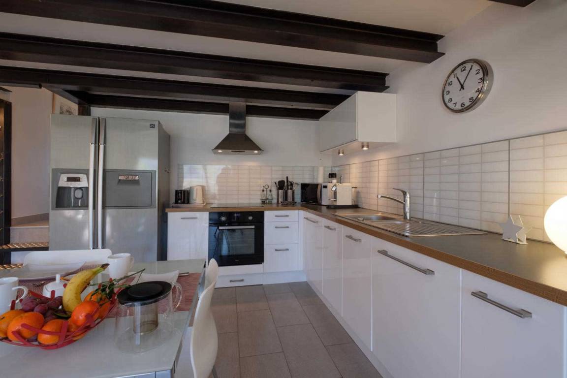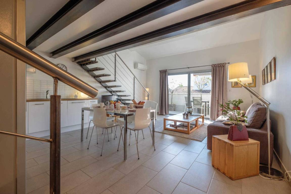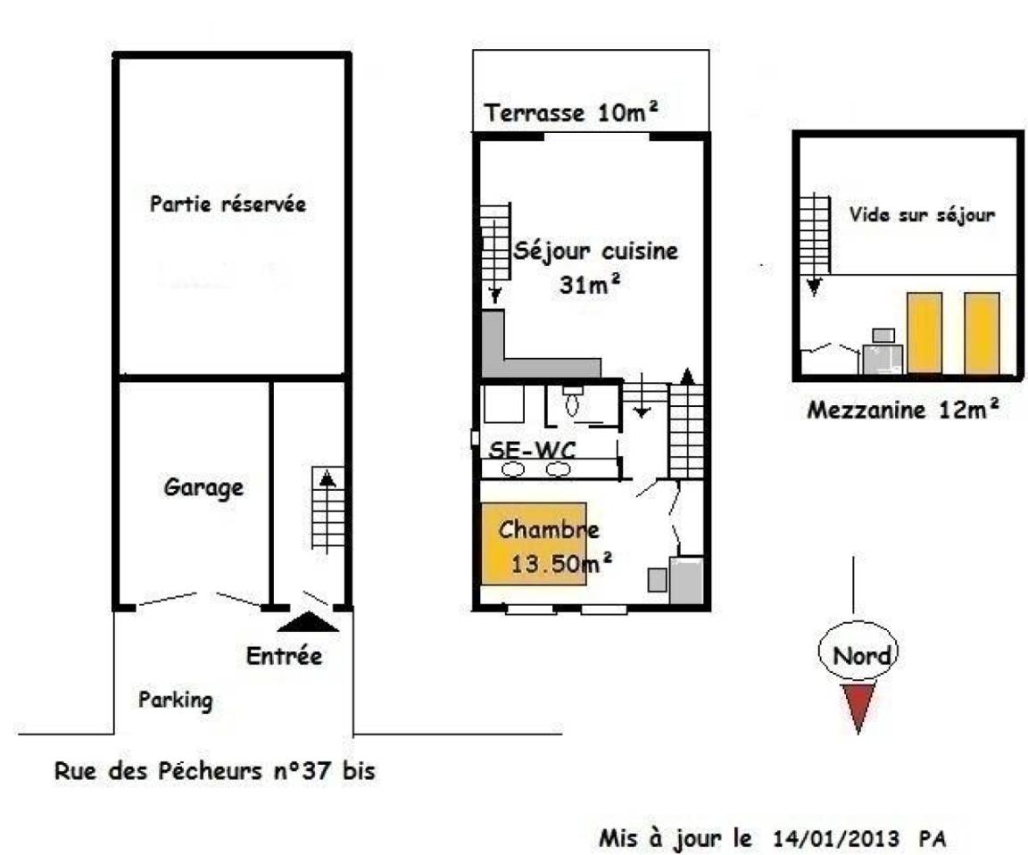 Erdgeschoss, Eingang und Garage. Im Obergeschoss, große Küche auf der Terrasse von 10 m ², Schlafcouch, Schlafzimmer mit Bett 160, Dusche - wc, Schlafzimmer Mezzanine mit 2 Betten 90 geben. Trockene Wäsche und Grill. Umschaltbare Klimaanlage, Wi-Fi und Tier akzeptiert bedingt.