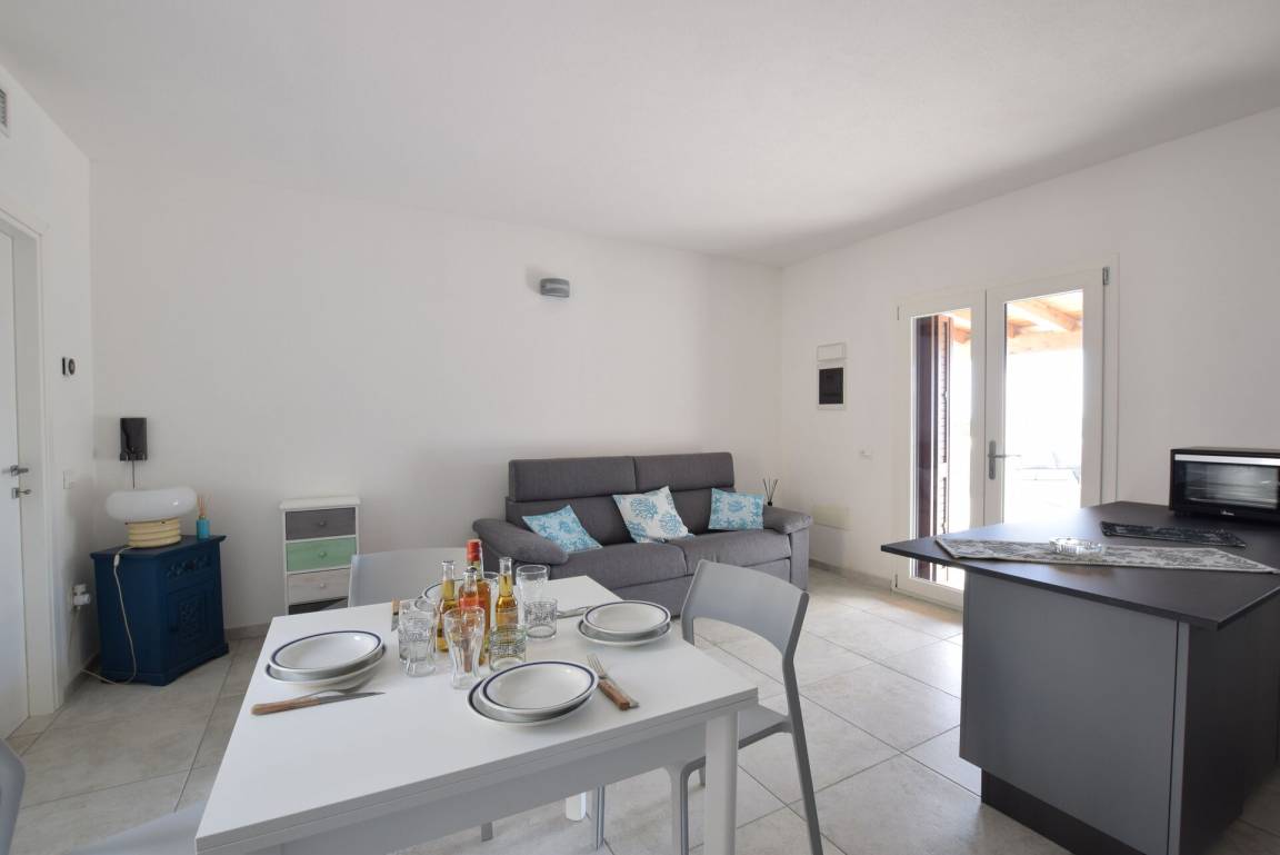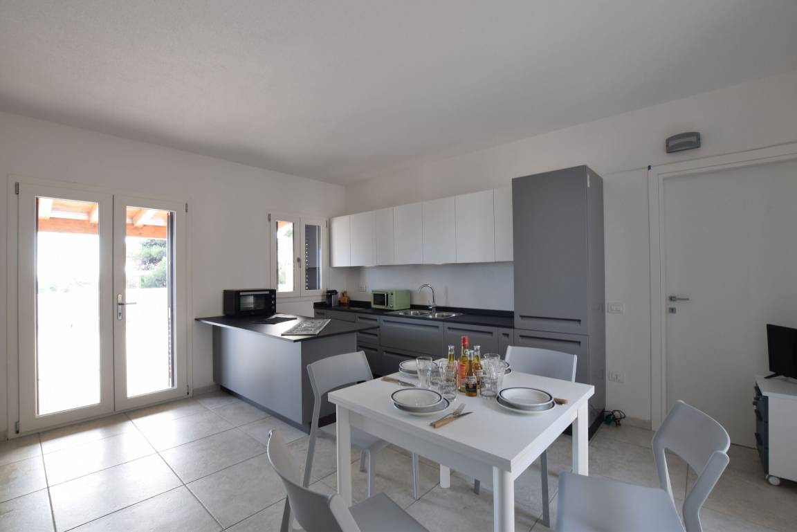 Wohnküche: Esstisch, Spülmaschine, Kühlschrank, Tiefkühler, Mikrowelle, Herd, Ofen, Italienische Kaffeemaschine, Doppel-Schlafsofa, WiFi Internet, Klimaanlage, Fliegengitter, TV.