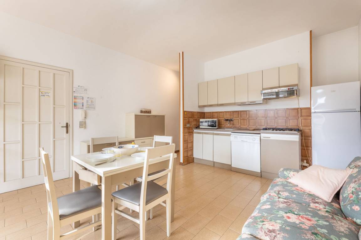 Wohnküche: gut ausgestattete Küche, Esstisch, Spülmaschine, Kühlschrank, Tiefkühler, Mikrowelle, Doppel-Schlafsofa, Klimaanlage, Ausgang auf den Balkon.