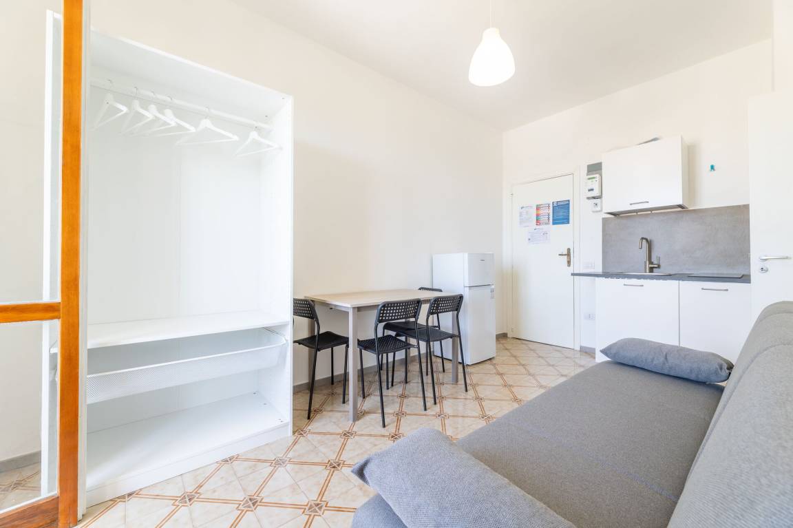 Wohnküche: gut ausgestattete Küche, Esstisch, Kühlschrank, Tiefkühler, Herd, Sofa bed (Breite: 140m, Länge: 190m), Klimaanlage, TV, Ausgang auf den Balkon.