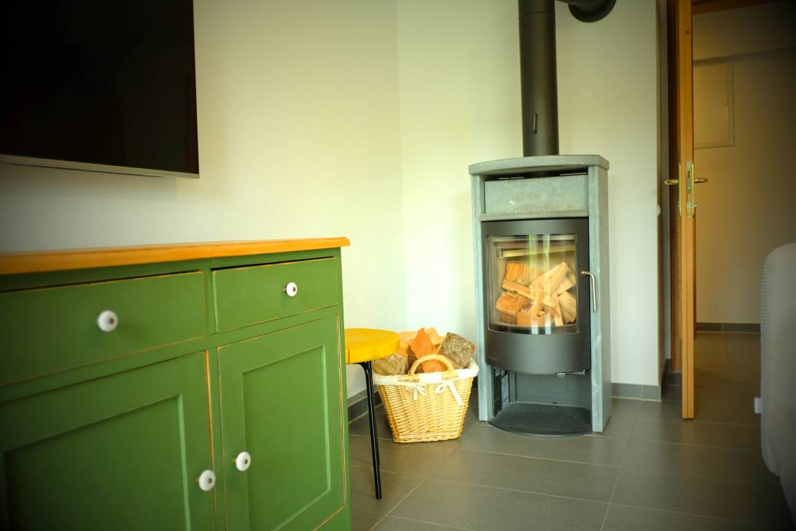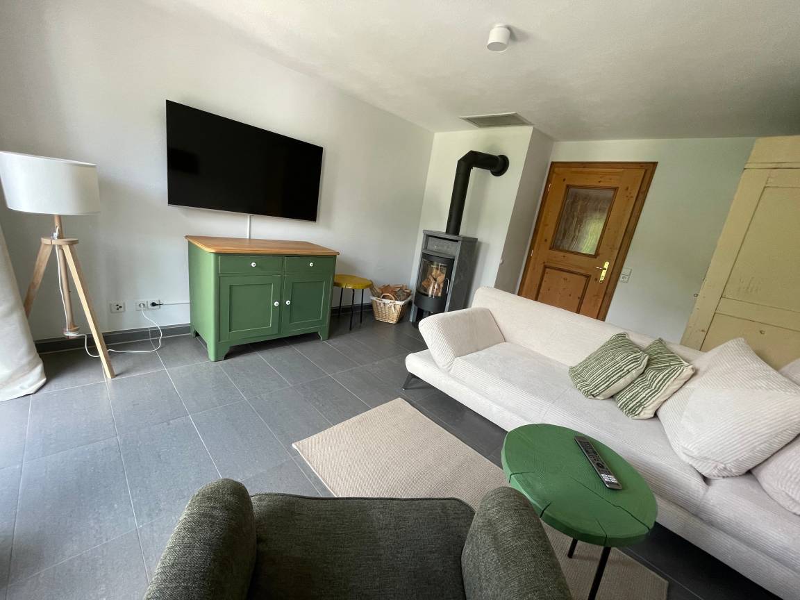 Gemütliches Wohnzimmer mit (Schlaf-)Sofa, Sessel und Kaminofen.
