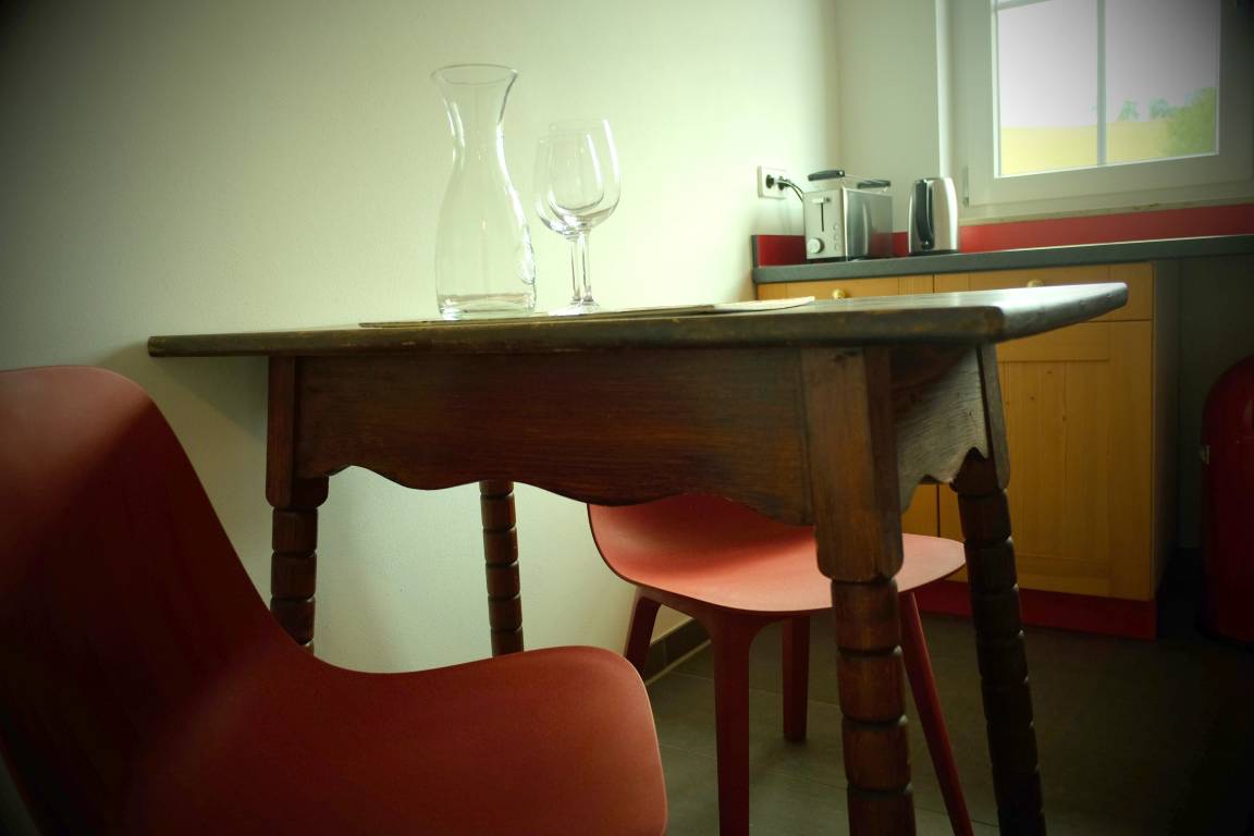 Kleiner Frühstückstisch mit zwei Stühlen.