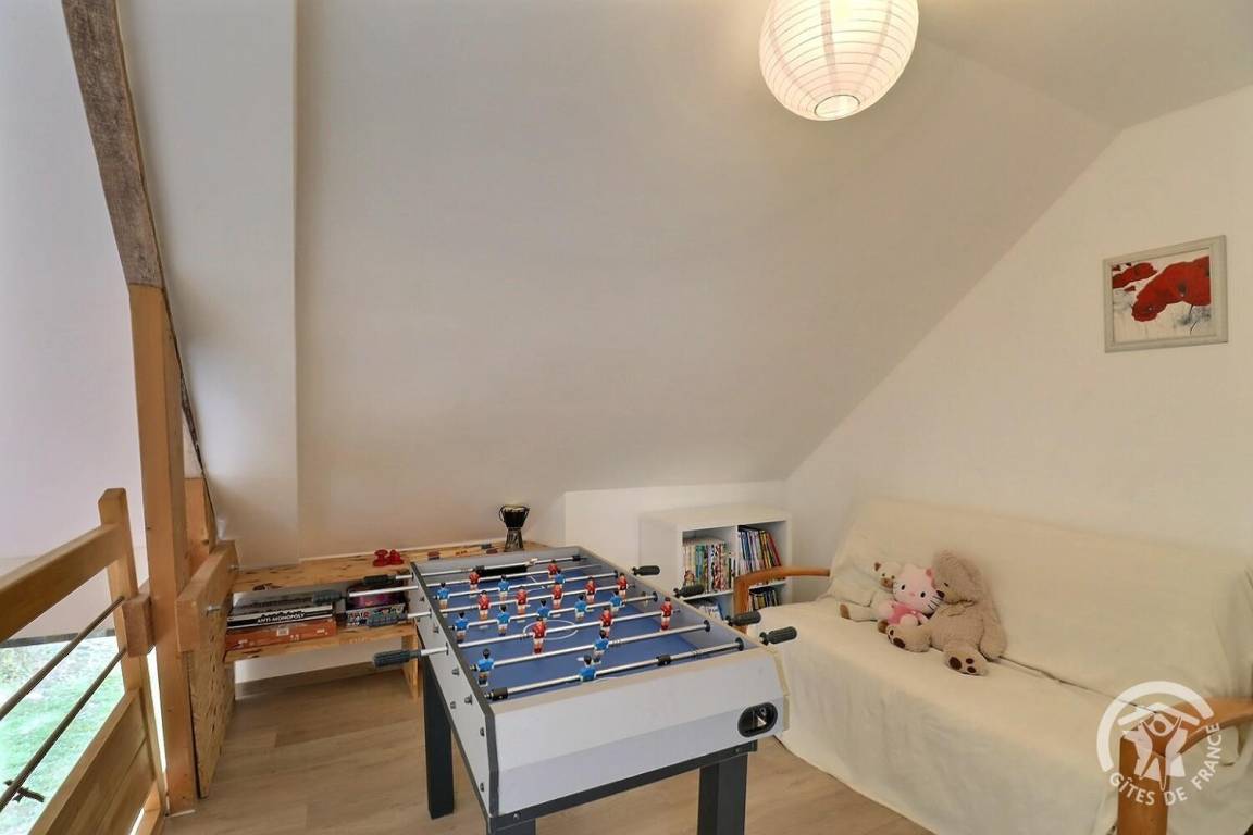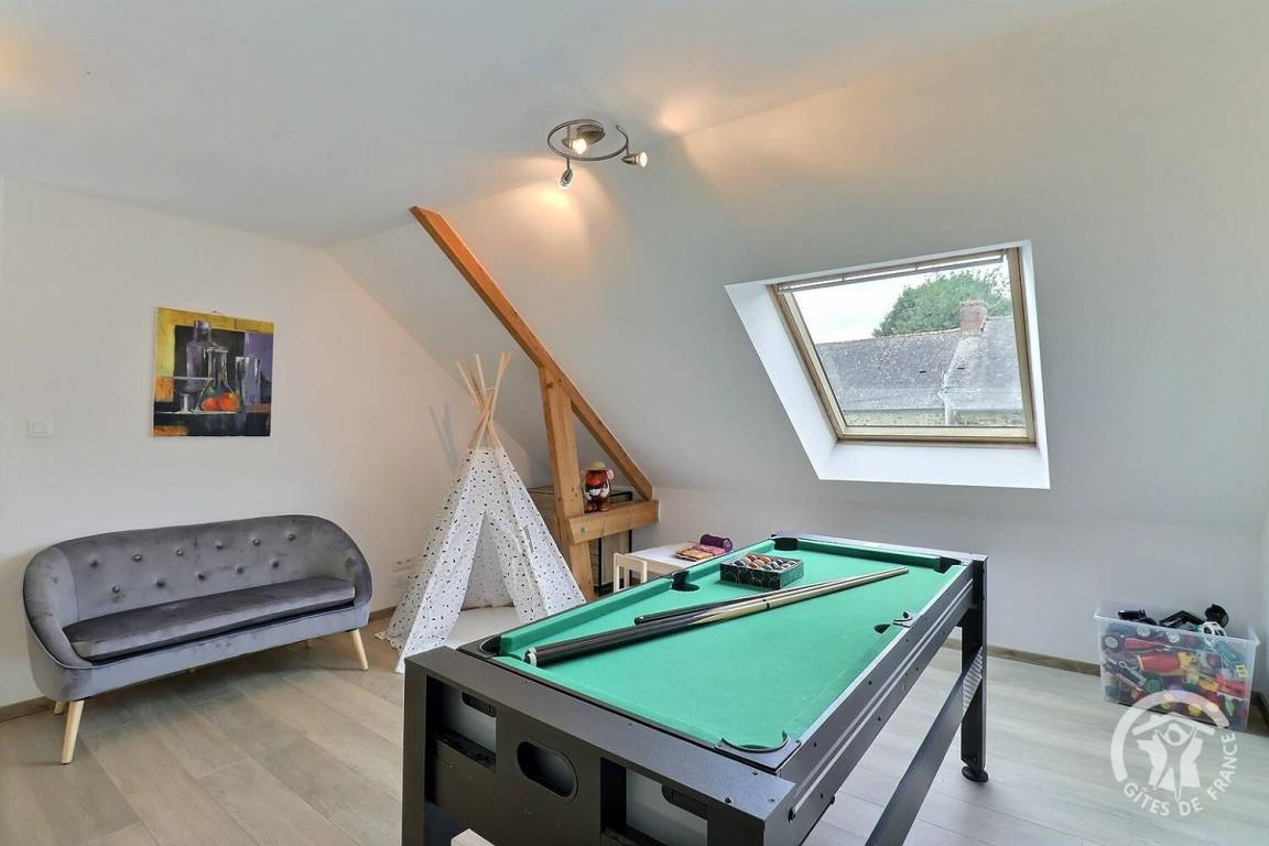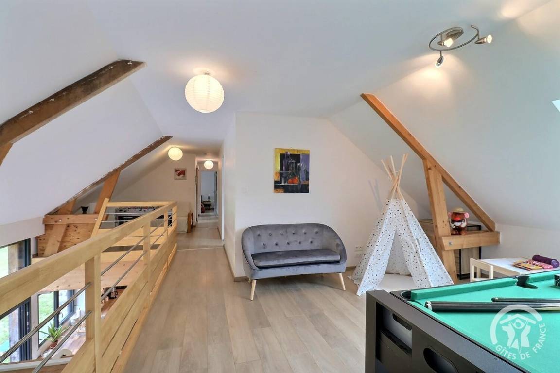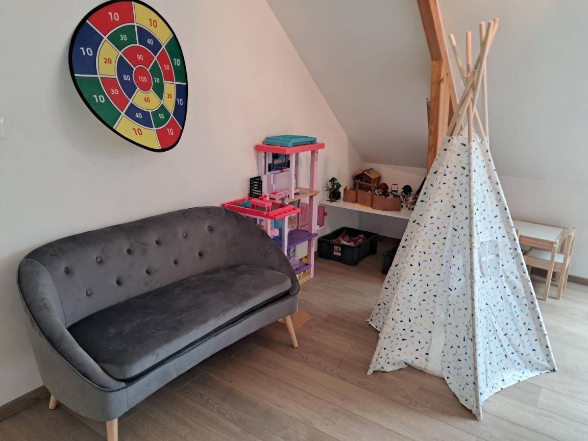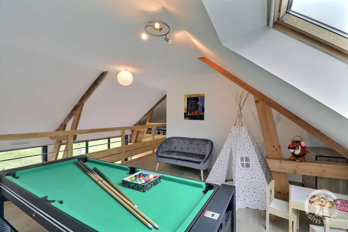 - ein großes Zwischengeschoss mit Billard, Tipi und kleinem Tisch für Kinder, Tischfußball, Entspannungs- und Lesebereich
