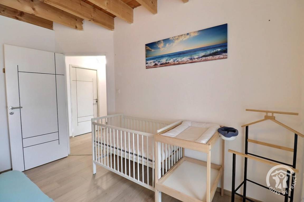 - ein Schlafzimmer mit einem 160 x 200 cm großen Bett, einem Babybett und einem Wickeltisch