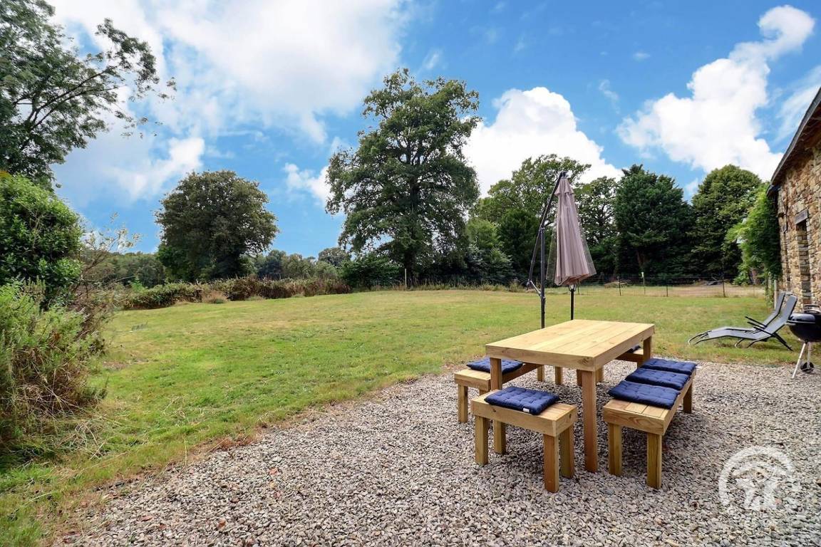 - auf der Rückseite des Hauses eine umzäunte Rasenfläche mit einer Kiesterrasse mit Gartenmöbeln, Liegestühlen, Sonnenschirm und Grill
