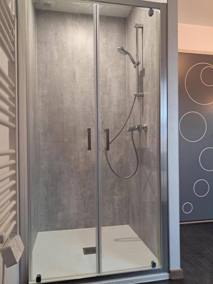 - ein Badezimmer mit Dusche und WC