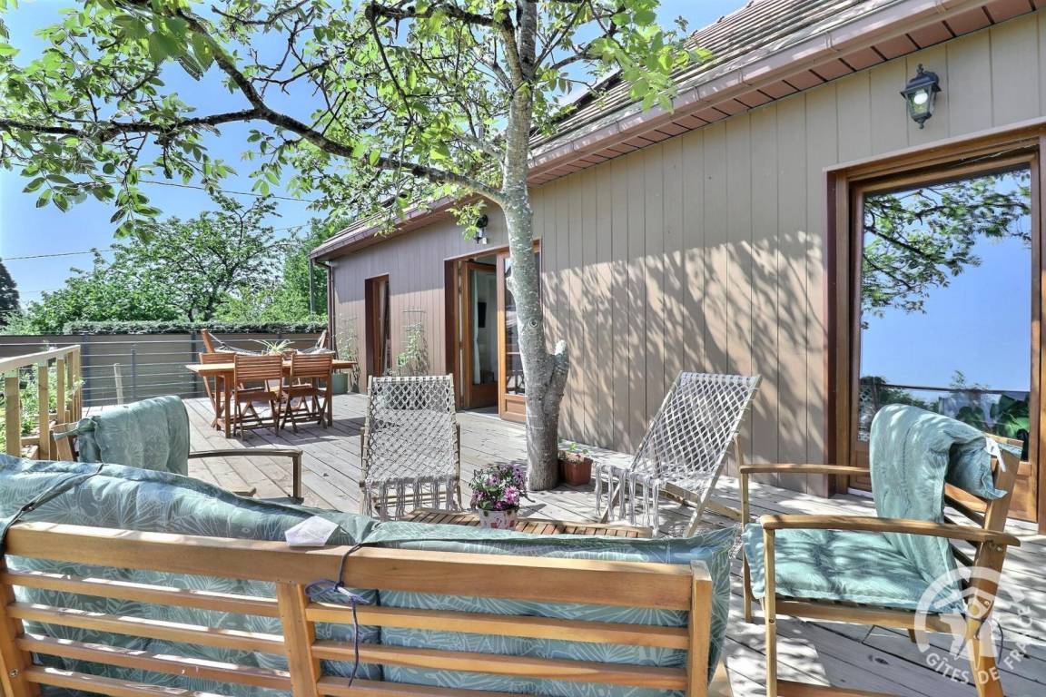 - einer großen Terrasse mit Gartentisch, Gartenmöbeln, Liegestühlen und Hängematte