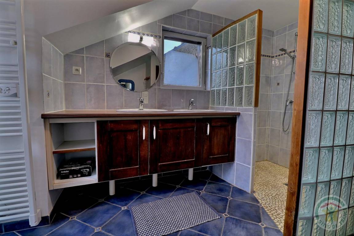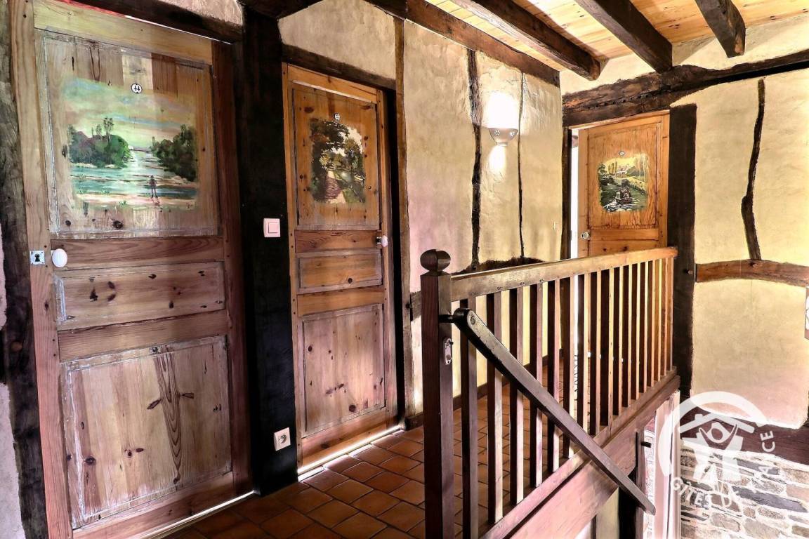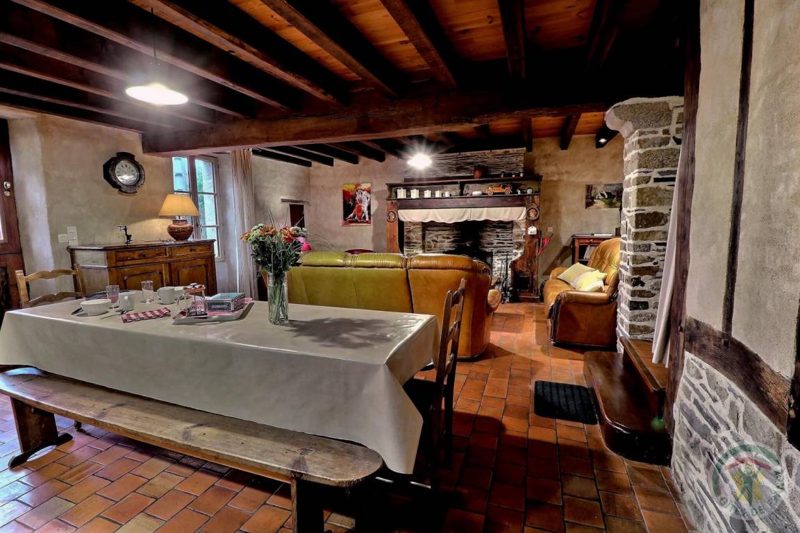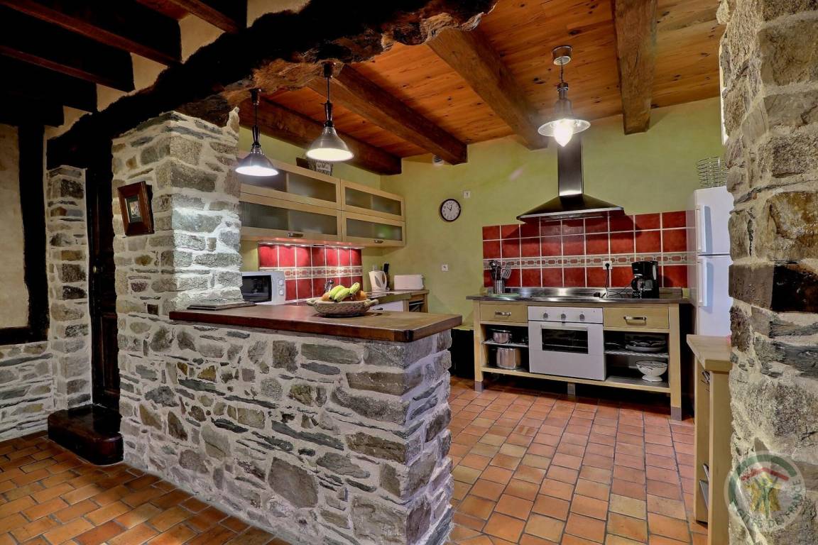 EG: schönes rustikales Esszimmer mit einem großen traditionellen Kamin, Wohnzimmerecke, Einbauküche, Büro, WC, Waschküche. Stockwerk: 1 Schlafzimmer 1 Doppelbett (Babybett auf Anfrage), 1 Schlafzimmer 1 Doppelbett, 1 Schlafzimmer 1 Doppelbett + 1 Einzelbett + eigenes Bad mit Dusche und WC, kompletter Sanitärbereich (Dusche, Waschbecken und WC). Elektrische Heizung (gut isoliertes Ferienhaus durch Hanf).