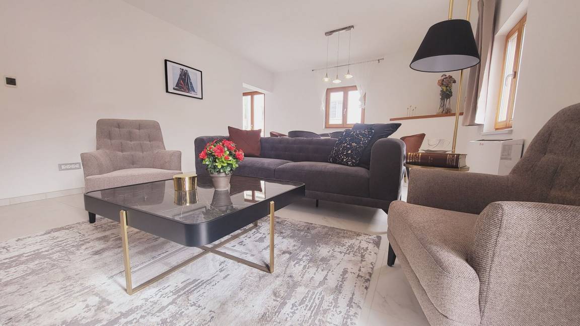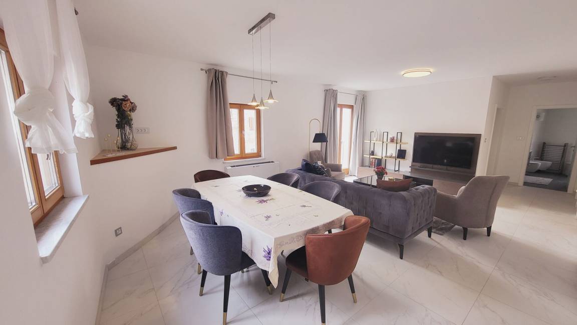 Wohnzimmer: Sofa, Sessel, Esstisch, WiFi Internet, TV.
