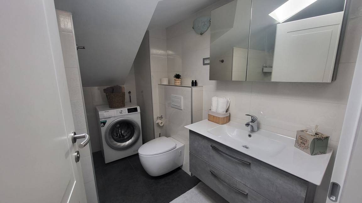 Badezimmer: Waschbecken, WC, Dusche, Waschmaschine.