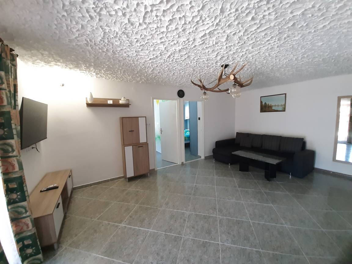 Hier gibt es 2 Schlafzimmern ( ein mit Doppelbett,andere mit 2 Einzelbetten ),Wohnzimmer ( mit ausklappbares Bett für 2 Personen ), Küche mit Essbereich, Badezimmer mit Wc, Terrasse,Klimaanlage.