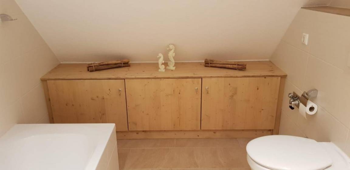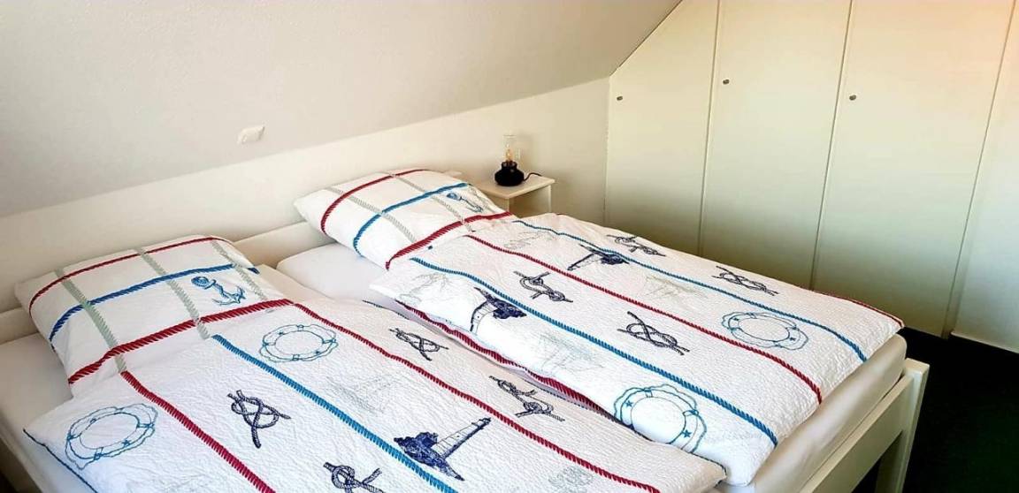 Die Ferienwohnung Oberdeck 320 ist 49 m² groß und besteht aus zwei Schlafräumen ( ein Zimmer mit Doppelbett, ein Zimmer mit zwei Einzelbetten), ein Wohn-Essraum mit Küchenzeile und gemütlicher Sitzecke mit typischem Ostfriesensofa. Das Badezimmer ist mit einer Dusch-/ Wannenkombination ausgestattet ,hell und geräumig.
