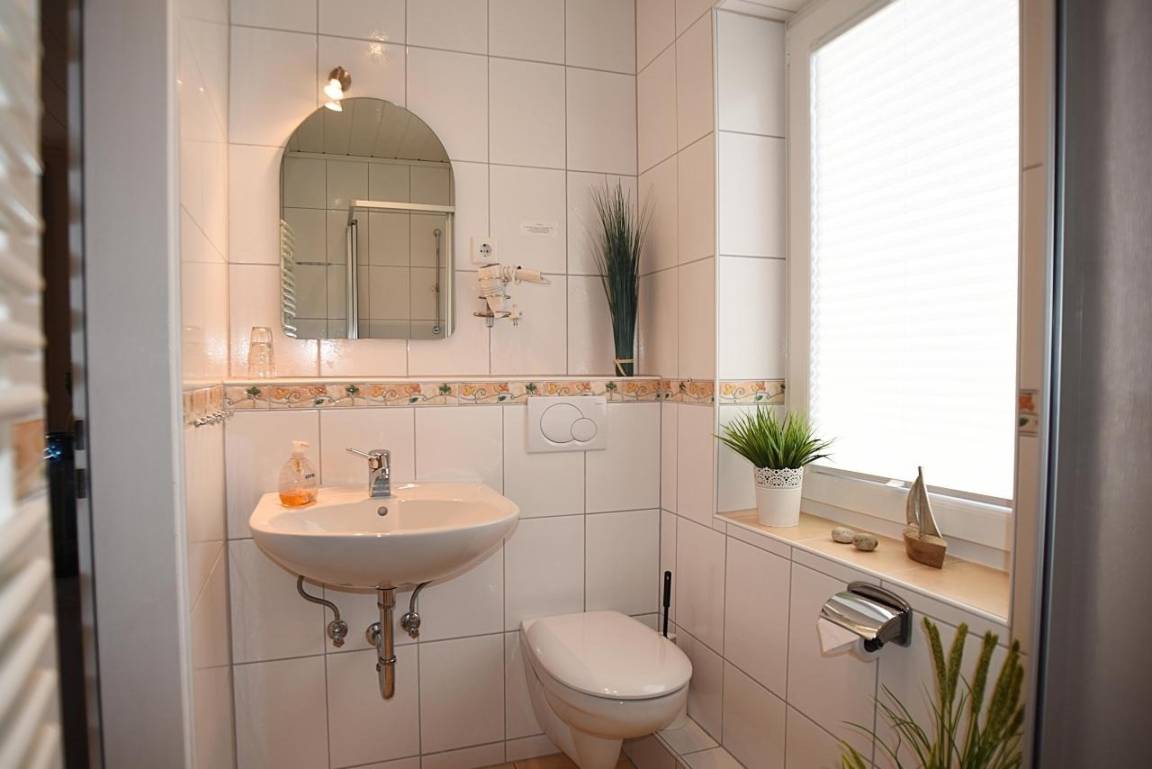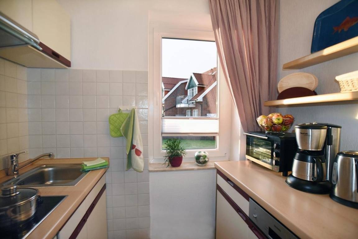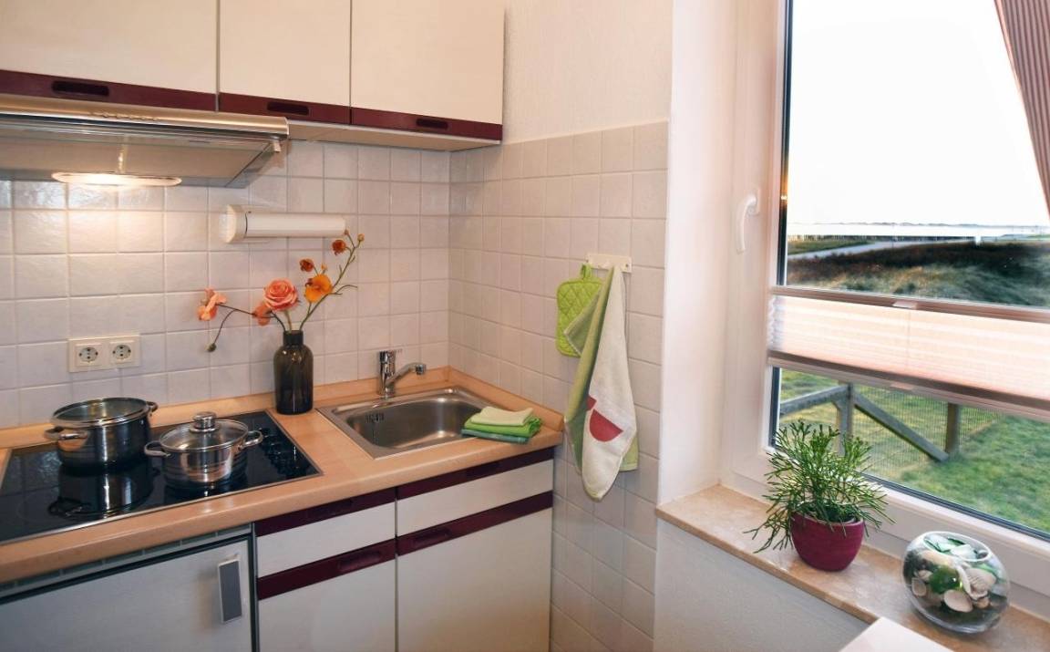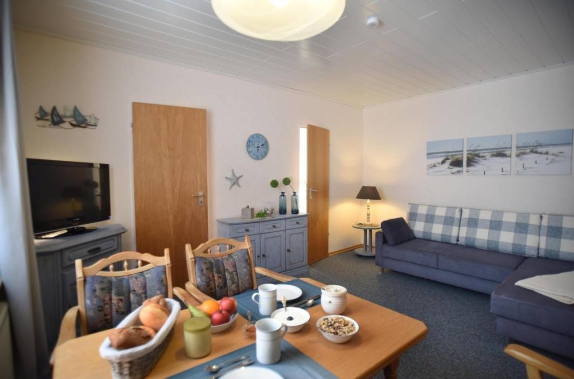 Ferienwohnung im Erdgeschoss mit Blick Richtung Süden auf das Meer, den Hafen, und das Ostende von Norderney mit den Seehundbänken. Schlafzimmer mit Doppelbett 180 x 200 cm und Kleiderschrank, Wohnbereich mit Sitzecke, Sofa und Sat-TV, separate Küche mit Cerankochfeld und Geschirrspüler, Duschbad mit Fenster.