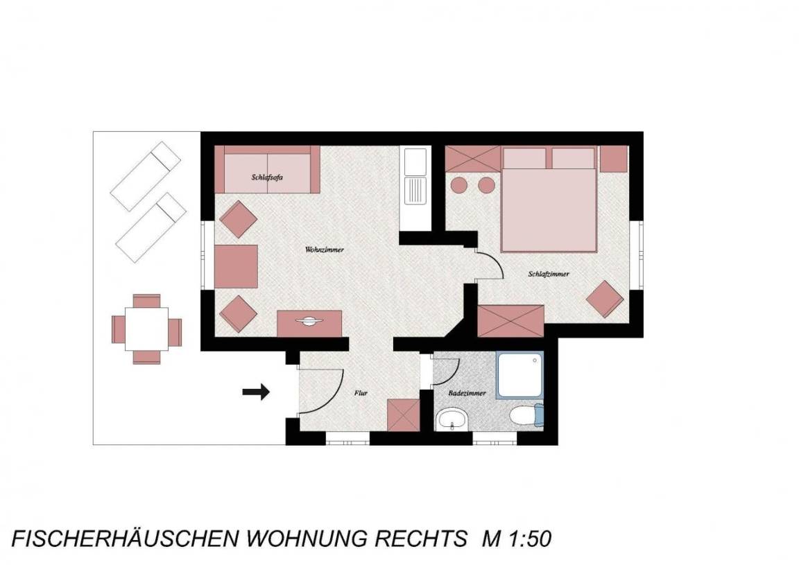 39 m² Ferienwohnung ∙ 1 Schlafzimmer ∙ 2 Gäste