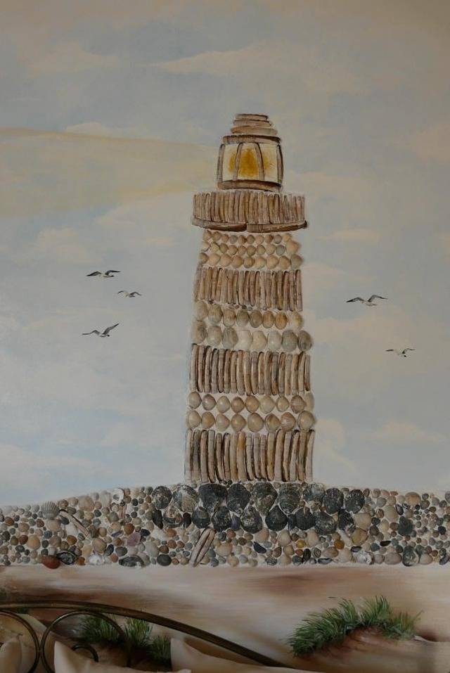 Wohnung für 2 Personen, sonnige Terrasse nach Süden, Doppelzimmer mit Doppelbett, Wohnzimmer mit Tagesbett und Küchenzeile, Naturmuschelwände mit Leuchtturm und Miesmuschelblumen, Dusche/WC, TV-Flachbildschirm & Stereoanlage, Wohnung in zentraler Lage