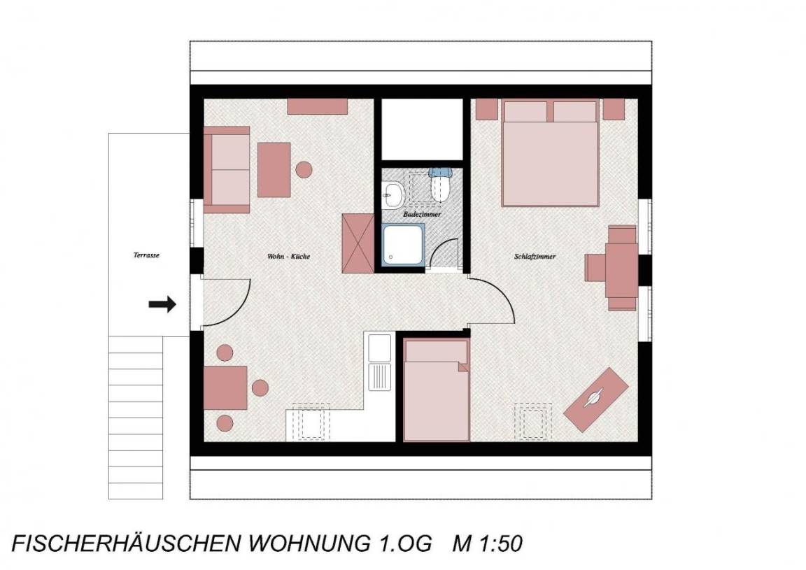 Die Wohnung ist geeignet für 2 bis 3 Personen mit einer Gesamtgröße von 47 qm. Sie ist herrlich urig eingerichtet und verfügt über folgende Raumaufteilung: Ein Wohn-Schlafzimmer sonnig und hell mit einem Kojenbett wie es früher üblich war und einen Doppelbett, TV und kleine Stereoanlage sind auch vorhanden. Im Eingangsbereich finden Sie eine Einbauküche und eine gemütliche Sitzecke. Von hier können Sie auf eine kleine Terrasse gehen und die Nachmittags- & Abendsonne genießen. Das Badezimmer ist mit Dusche und WC ausgestattet.