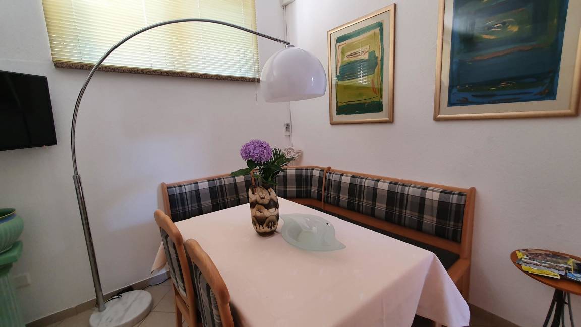 Der Essbereich ist liebevoll eingerichtet und verfügt über eine Essecke, die sich perfekt für intime Mahlzeiten vor dem Sat-TV eignet. Eine überdachte Terrasse lädt zum Frühstück im Grünen des Gartens ein.