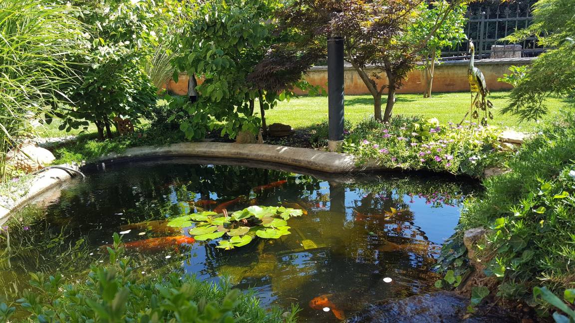 Zur Verfügung stehen Gartenmöbel, Sonnenliegen, ein Grill, Liegewiesen, ein Teich und ein Wäscheständer.