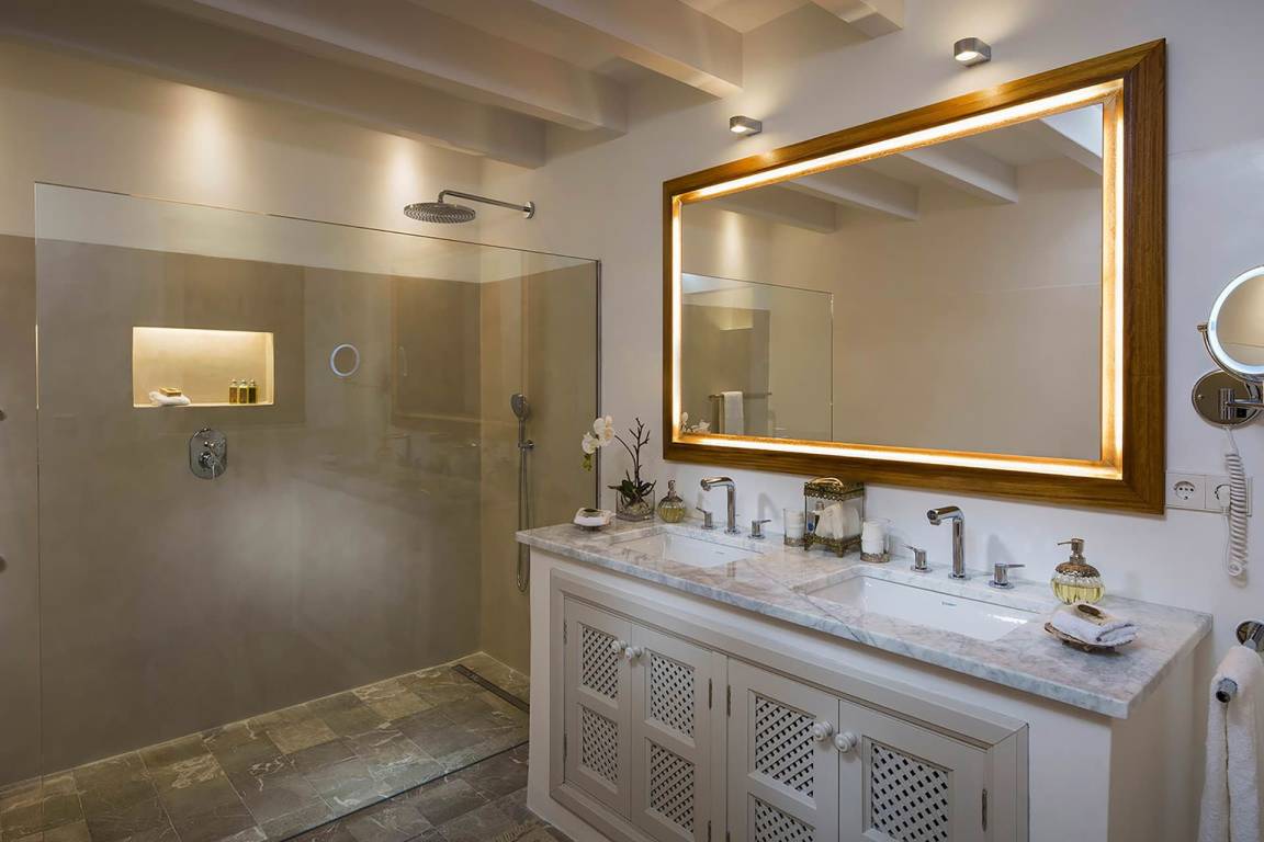 Die Villa umfasst 4 Schlafzimmer, 4 Badezimmer und bietet Platz für bis zu 8 Gäste. Das Erdgeschoss beherbergt ein geräumiges Wohnzimmer mit Kamin mit offenem Herd, Sofas und Flachbildfernseher mit Sky-Anschluss, Spielkonsolen und einer Buchsammlung, sowie ein separates Esszimmer mit einem zweiten Kamin mit offenem Herd. Die vollständig ausgestattete Küche ist ebenfalls auf dieser Ebene angeordnet. Von den 4 Schlafzimmern sind 2 größere Doppelzimmer mit je 28 Quadratmetern, während die beiden übrigen Zimmer je 22 Quadratmeter messen. Ein kleineres Zimmer ist mit einem Doppelbett ausgestattet, das andere mit 2 Einzelbetten, die auf Anfrage zusammengestellt werden können. Alle 4 Schlafzimmer verfügen über ein eigenes Badezimmer, einen Haartrockner, ein Telefon, einen tragbaren Safe in Laptop-Größe, tragbare Bose-Mini-Lautsprecher, Bademäntel, Toilettenartikel, internationale Steckdosen mit USB-Anschlüssen, eine Taschenlampe und einen Satz GHD-Glätter.