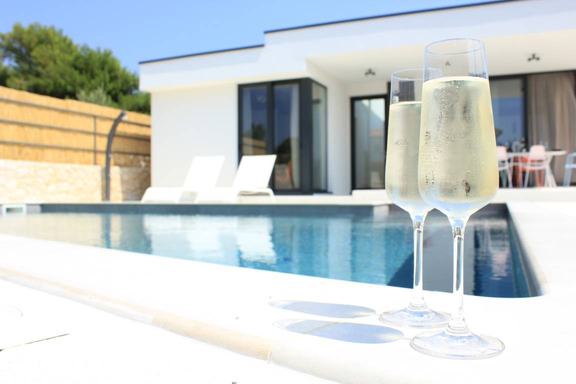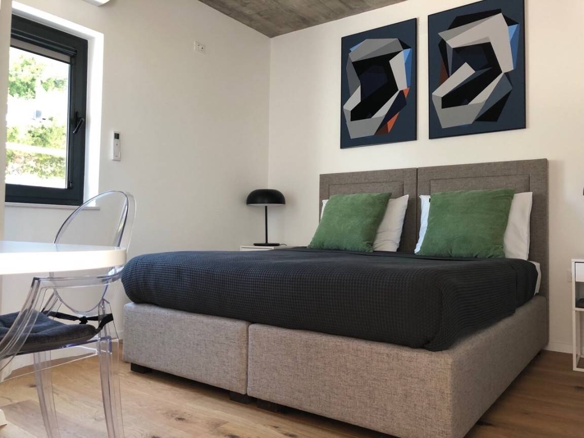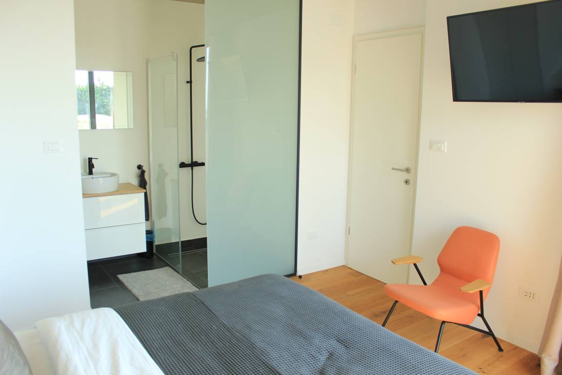Das Schlafzimmer hat ein großes Doppelbett von 200 x 180 cm. Es gibt auch einen Kleiderschrank, einen LCD-Smart-TV, ein Bügeleisen, einen Safe und Designerlampen von Artemide. Das Schlafzimmer hat direkten Zugang zum Pool und zur Terrasse.