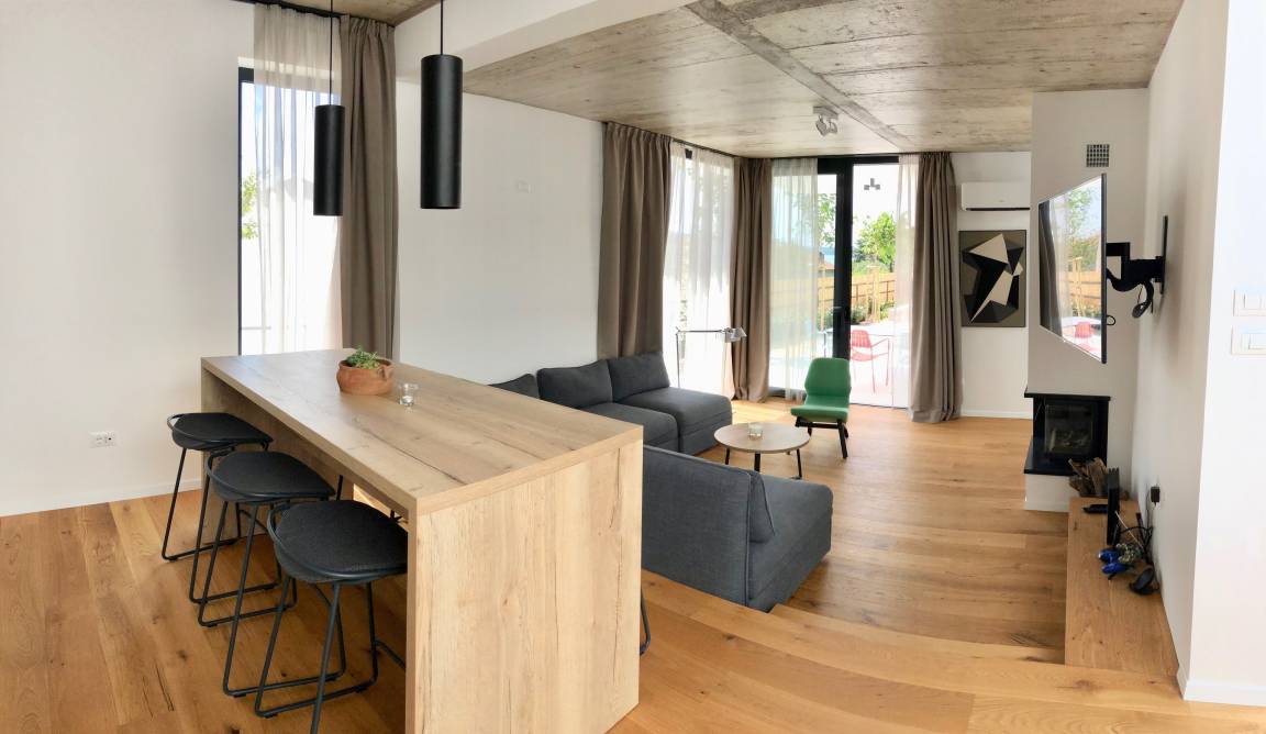 Küche und Essbereich haben eine Gesamtgröße von 15 m². Voll ausgestattete Küche mit Backofen, Kühlschrank mit Gefrierfach, Geschirrspüler, Elektroherd (Induktion), Kaffeemaschine, Wasserkocher, Toaster, Hochtisch, 6 Stühlen von Prostoria, Umgebungslicht.