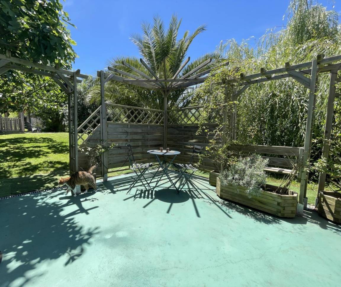 Private Terrasse 21 m² mit Gartenmöbeln und Liegestühlen. Gemeinsamer Grillplatz. Gemeinsamer Parkplatz.
