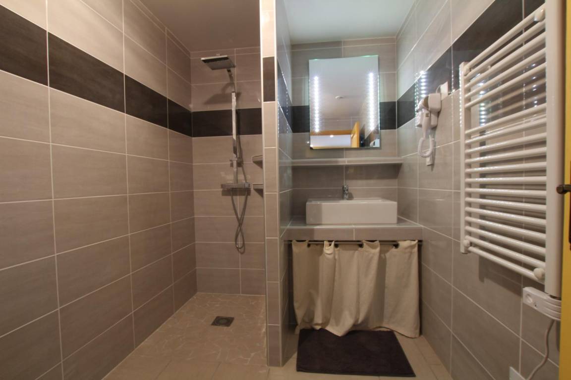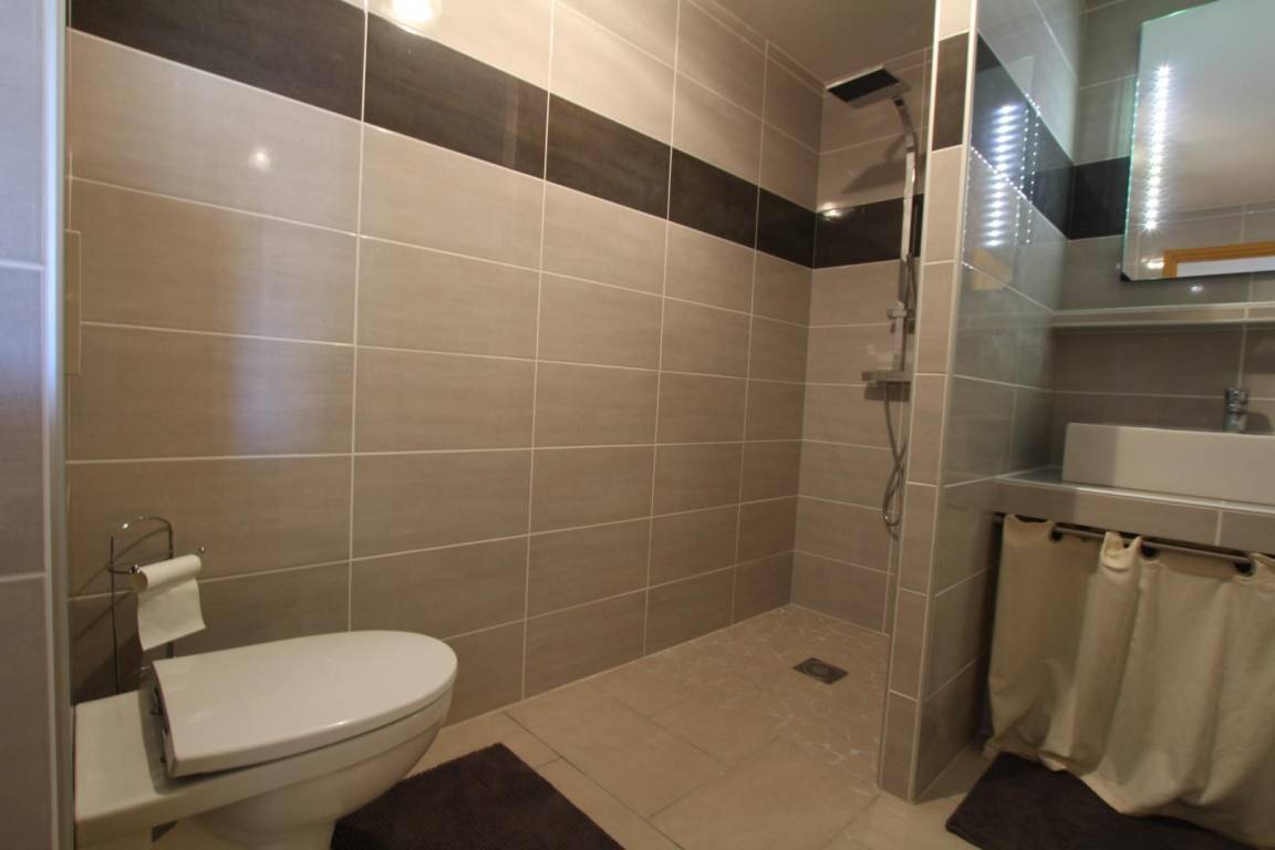 1 Schlafzimmer (1 Bett 160). Badezimmer mit italienischer Dusche, Waschbecken und Toilette.