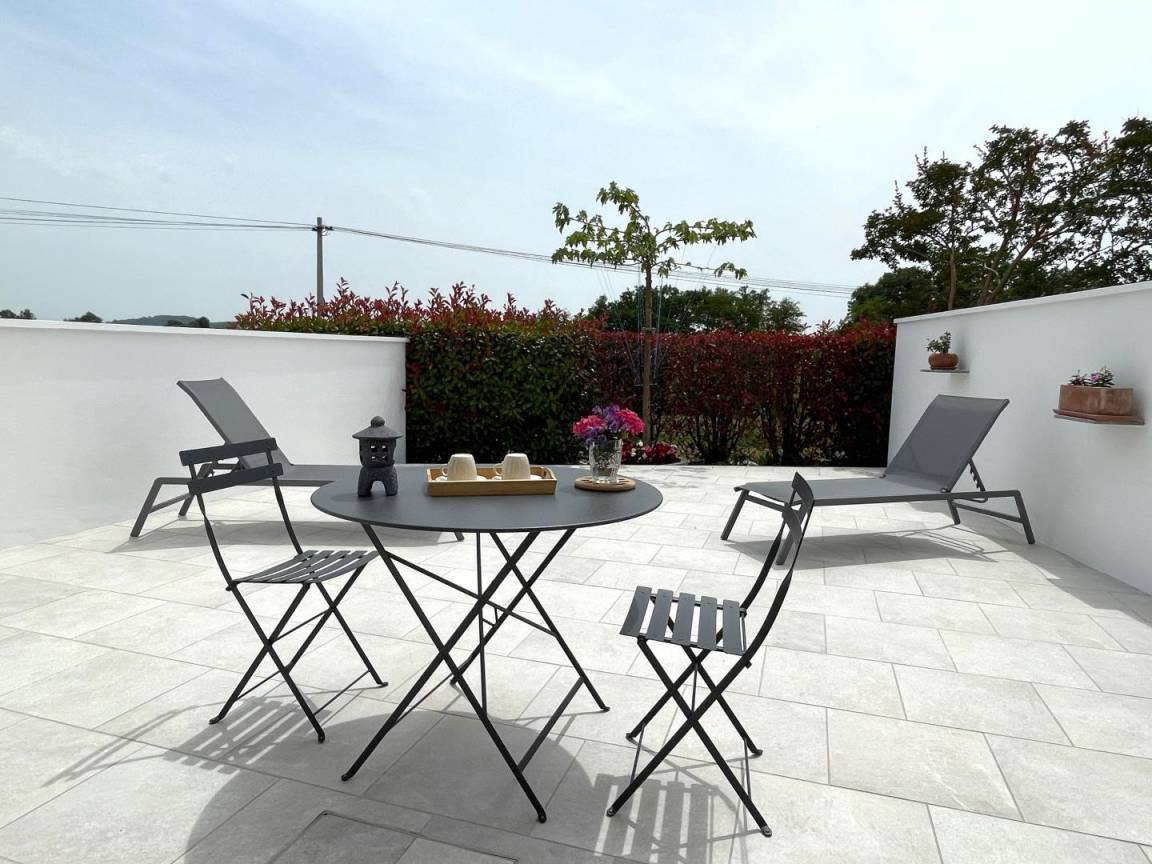 Die Terrasse ist mit Tisch, Stühlen, Liegestühlen und einem Sonnenschirm ausgestattet. Der Zugang erfolgt über eine Treppe von Ihrem privaten Parkplatz. Zwei Fahrräder für Erwachsene stehen Ihnen zur Verfügung.