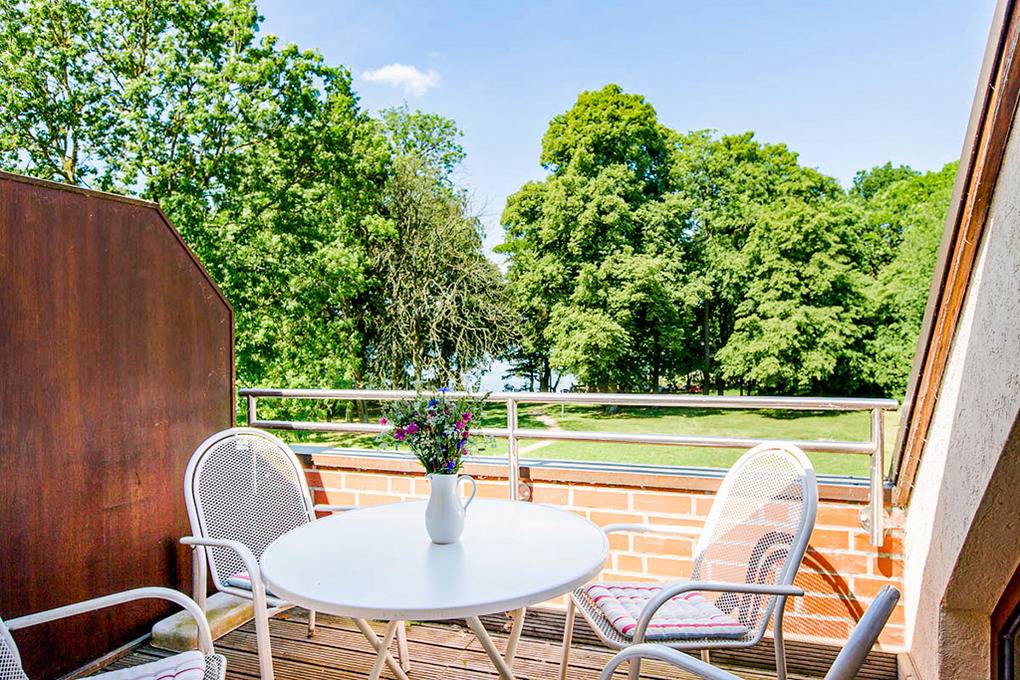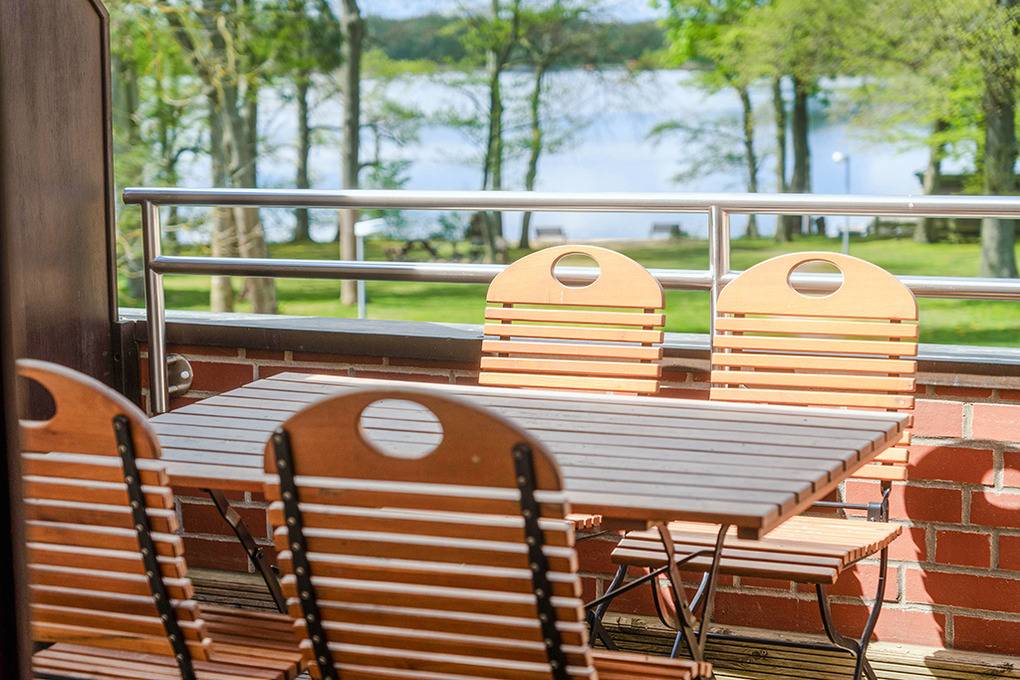 D 47.155 Wohnung 2-4 Pers.: 2-Zimmerwohnung mit 46 qm Wohnfläche, 1. Etage. Wohn-/Schlafraum mit gemütlicher Sofa-Sitzecke (Schlafsofa 2 Pers), Sat-TV, Radio/CD, Esstisch, Küchenzeile (Backofen, Spülmaschine). Doppelzimmer. Bad: Dusche, Wb, WC. Großer Balkon zum See mit Sitzmöbeln, schönem Wasserblick.