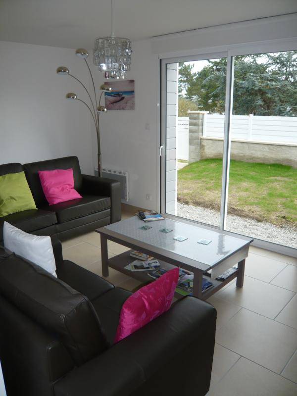 Einstöckiges Haus mit angrenzender Wohnung im 1. Stock mit separatem Eingang. Wohnzimmer mit Kochnische, Schlafzimmer 1 (2 Einzelbetten à 90 cm), Schlafzimmer 2 (2 Einzelbetten à 90 cm), Schlafzimmer 3 (1 Doppelbett). Jedes Schlafzimmer verfügt über ein eigenes Badezimmer. Separates WC. TV, DVD-Player, WLAN, Waschmaschine, Geschirrspüler. Elektroheizung gegen Aufpreis. Bettwäsche und Handtücher können gemietet werden. Reinigungsservice gegen Aufpreis. Babyausstattung (Hochstuhl + Kinderbett) auf Anfrage. Privates, eingezäuntes Grundstück. Terrasse mit Gartenmöbeln und Liegestühlen. Grill. Garage.