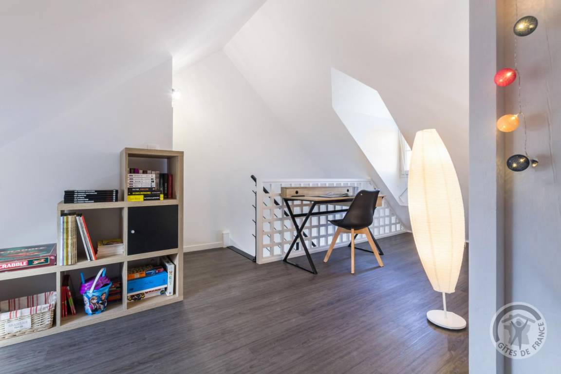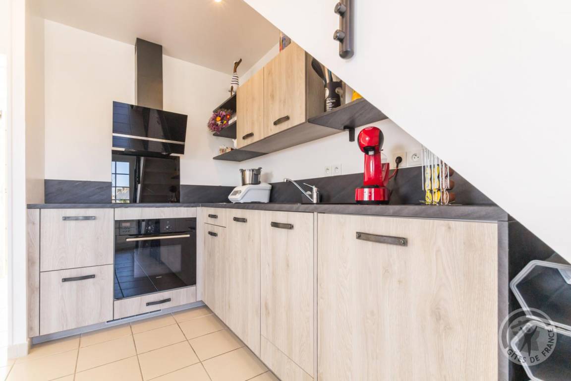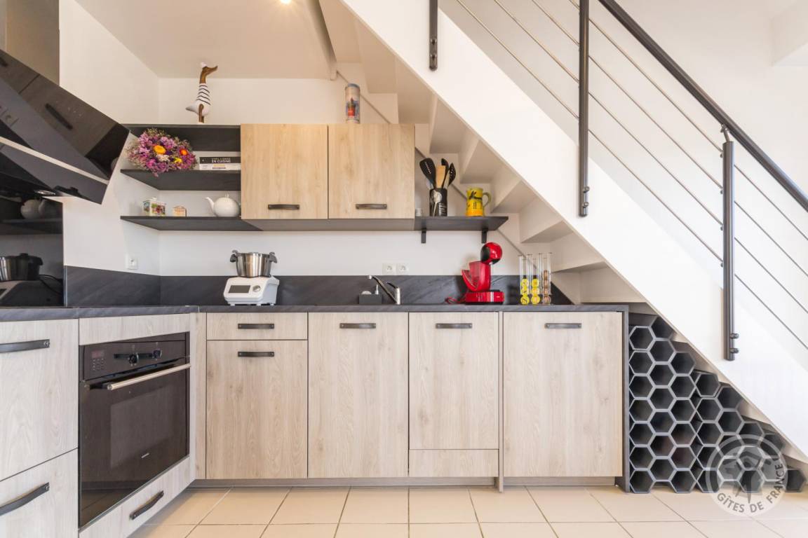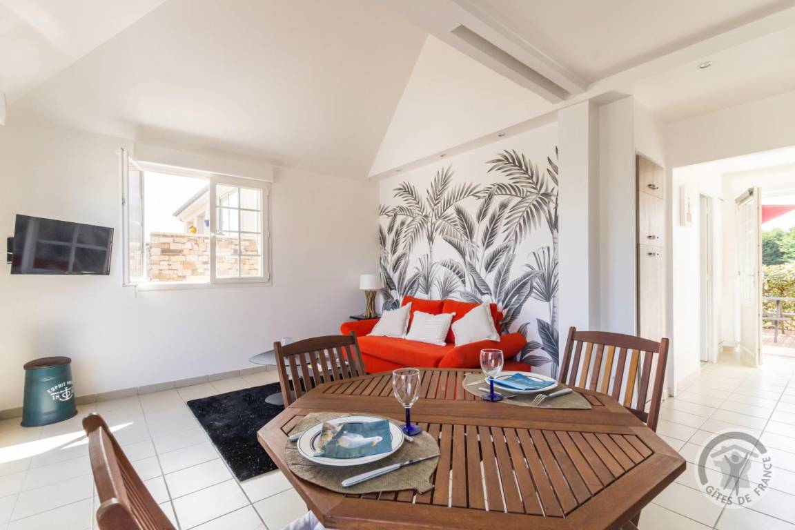 Apartment im 1. Stock eines kleinen Gebäudes (Zugang über eine Außentreppe). Eingang. Schlafzimmer (Queensize-Bett). Duschbad. WC. Voll ausgestattete, zum Wohnzimmer offene Küche (Backofen, Kühlschrank, Dolce Gusto Kaffeemaschine und Filterkaffeemaschine, Geschirrspüler, Mikrowelle, Waschmaschine). Wohnbereich (TV). Zugang zu einem Balkon/einer Terrasse. Im Obergeschoss befindet sich ein Schlafzimmer auf einer Galerie (zwei ausziehbare Einzelbetten). Bettwäsche und Handtücher werden gestellt. Die Betten sind bei Ankunft bezogen. Elektrische Heizung inklusive. Alle Nebenkosten inklusive. Reinigungsservice gegen Aufpreis verfügbar. Private, umzäunte Terrasse gegenüber dem Eingang mit Gartenmöbeln und Liegestühlen. Kein Aufzug. Gemeinsamer Parkplatz im Gebäude. WLAN.