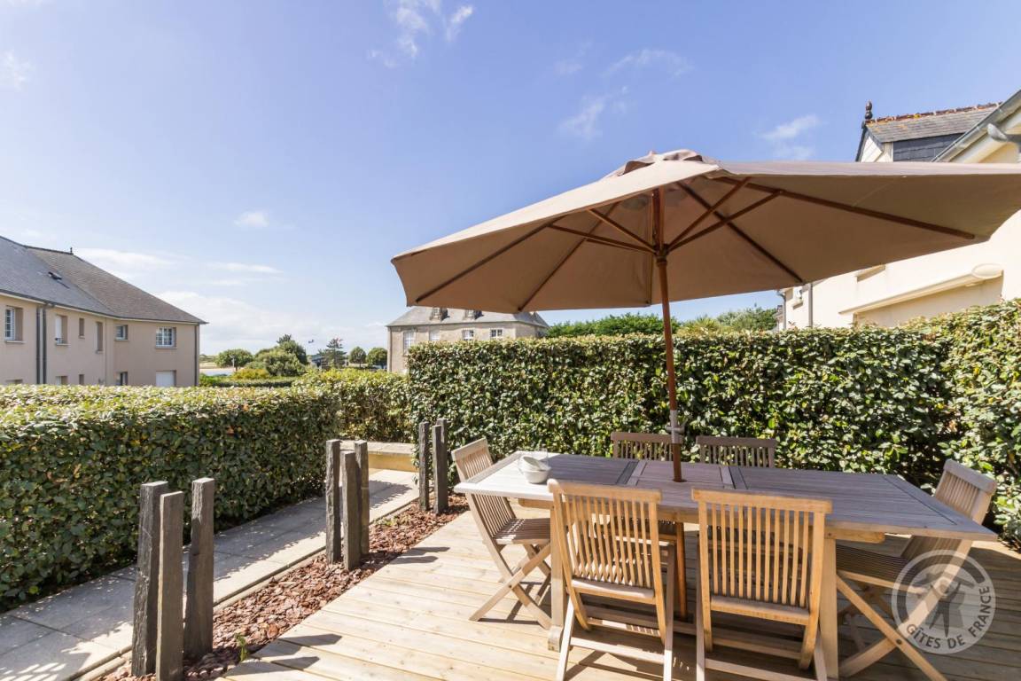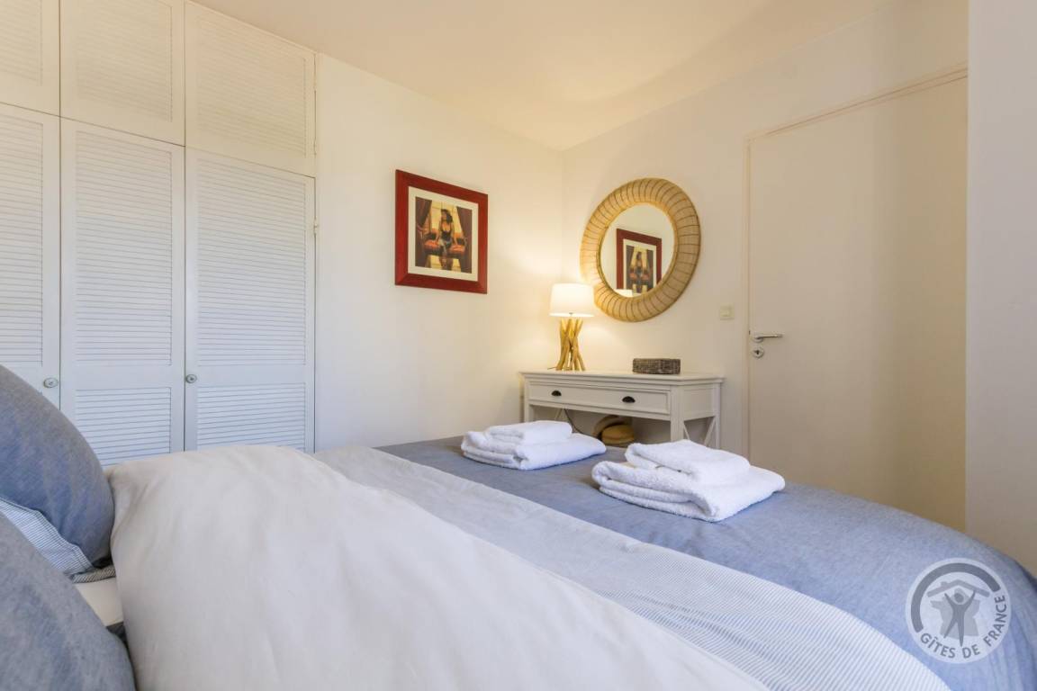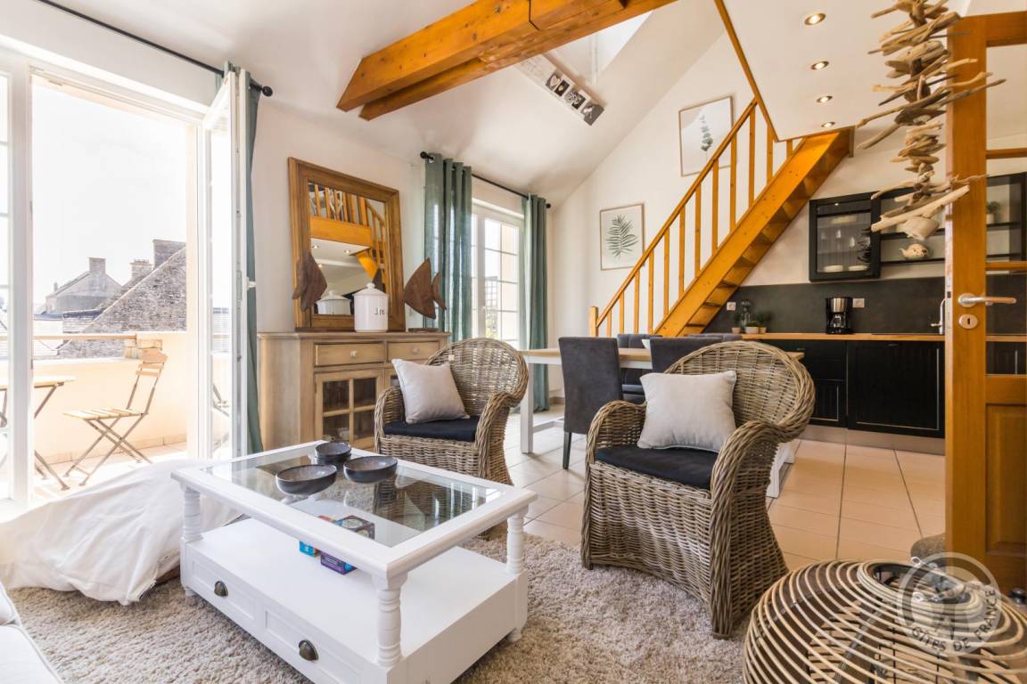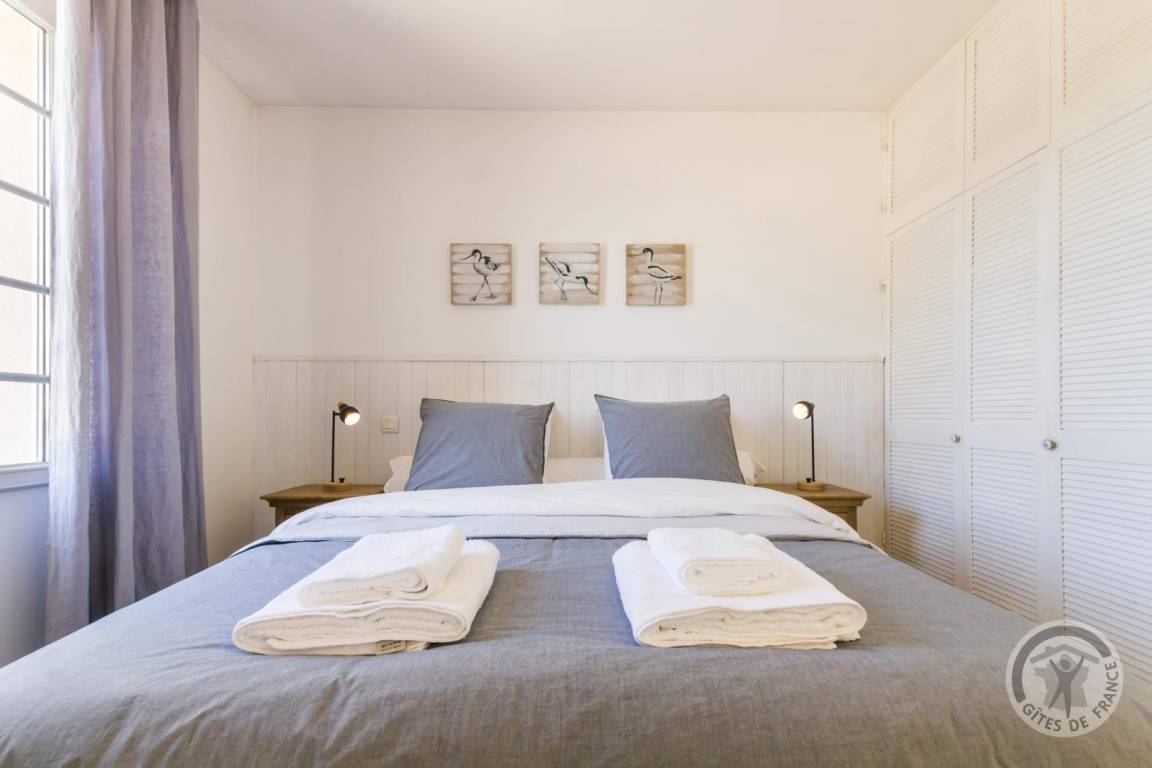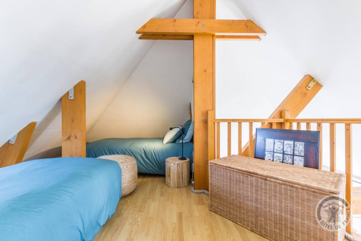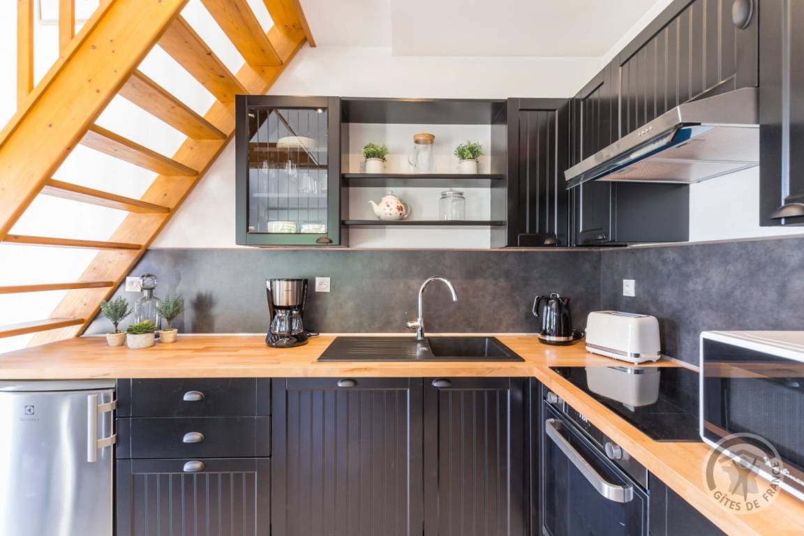 Apartment im 1. Stock eines kleinen Gebäudes (Zugang über eine Außentreppe). Eingang. Schlafzimmer (Queensize-Bett). Duschbad. WC. Offene Einbauküche mit Wohnbereich (Backofen, Geschirrspüler, Mikrowelle). Wohnbereich (TV, Internet). Zugang zu einem Balkon/einer Terrasse. Im Obergeschoss befindet sich ein Schlafzimmer auf einer Galerie (zwei Einzelbetten). Babyausstattung ist auf Anfrage erhältlich. Bettwäsche und Handtücher werden gestellt. Die Betten sind bei Ankunft bezogen. Keine Waschmaschine. Elektrische Heizung inklusive. Alle Nebenkosten inklusive. Endreinigung inklusive. Private, umzäunte Terrasse gegenüber dem Eingang mit Gartenmöbeln und Liegestühlen. Kein Aufzug. Gemeinsamer Parkplatz im Gebäude.