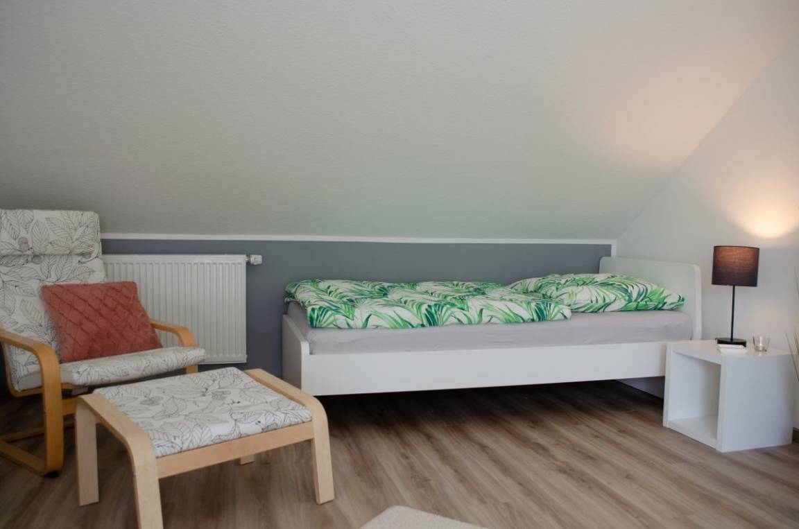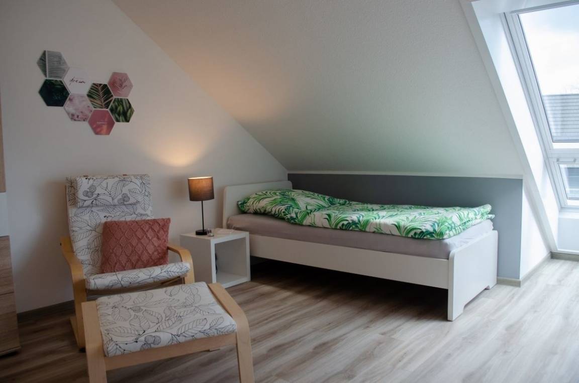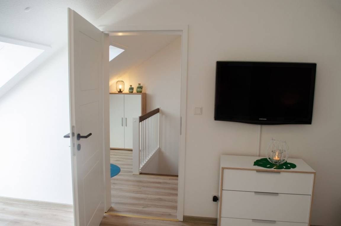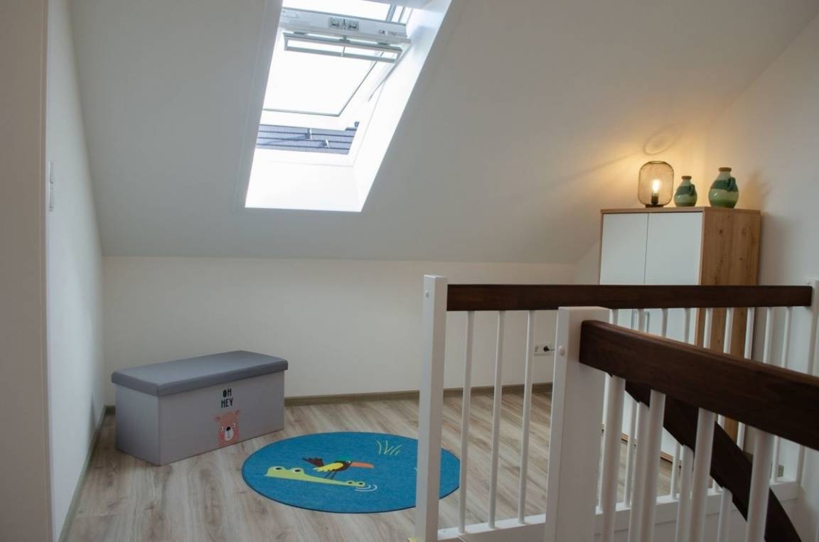Weiter finden Sie im Obergeschoss ein helles, großzügiges weiteres Schlafzimmer mit zwei Einzelbetten (0,9 x 2 m) vor, welches die Jüngsten der Familie zum ausgiebigen Spielen einlädt. Durch das VELUX CABRIO™-Dachfenster entsteht im Handumdrehen ein balkonähnlicher Dachaustritt und bietet somit einen wunderschönen Blick über die Dächer der benachbarten Häuser in Richtung Badesee. Auch finden Sie hier einen Smart-TV vor. Bei Bedarf kann noch eine weitere Schlafmöglichkeit durch ein hochwertiges Gästeklappbett (90 x 200 cm) hergerichtet werden.